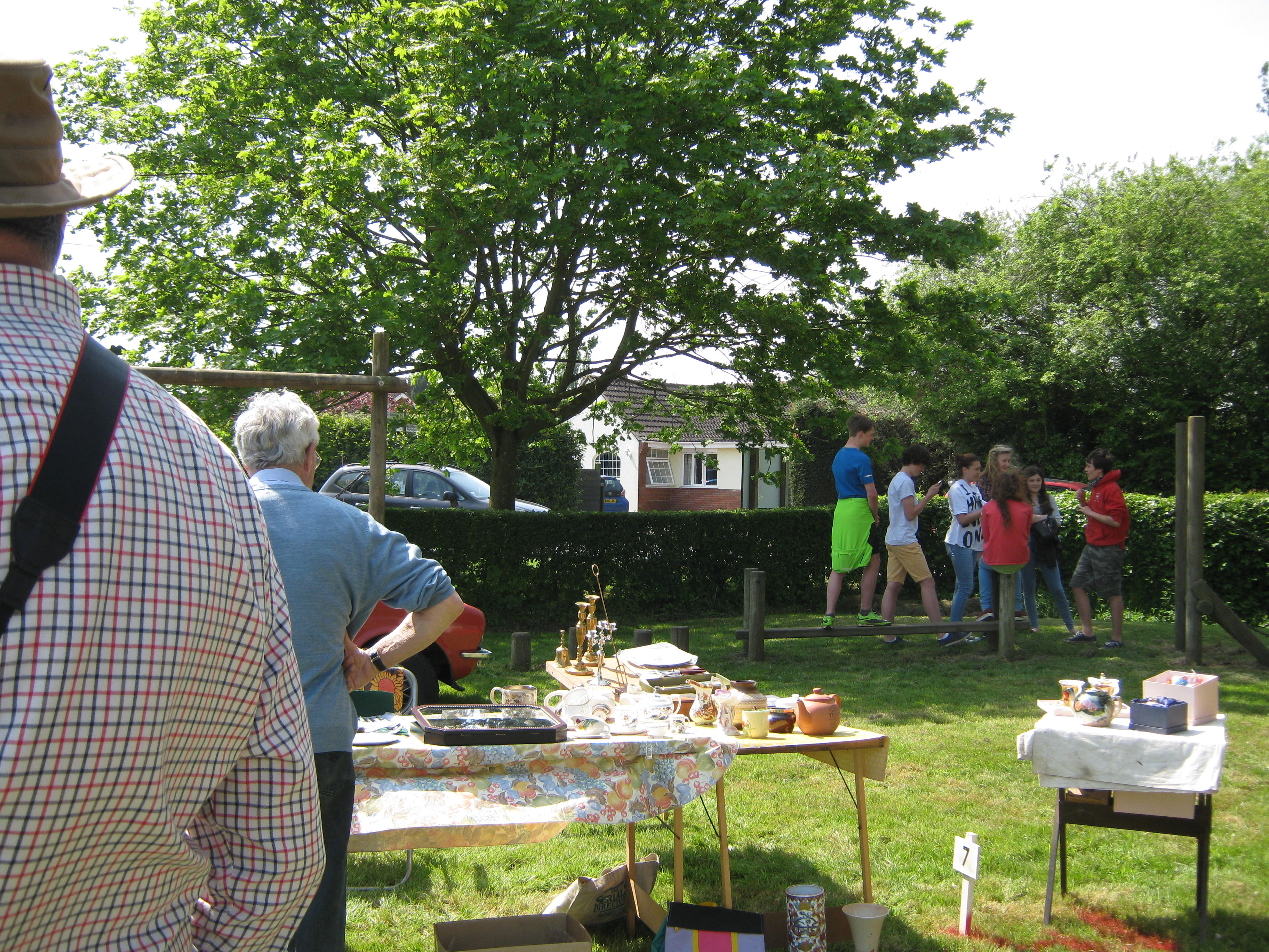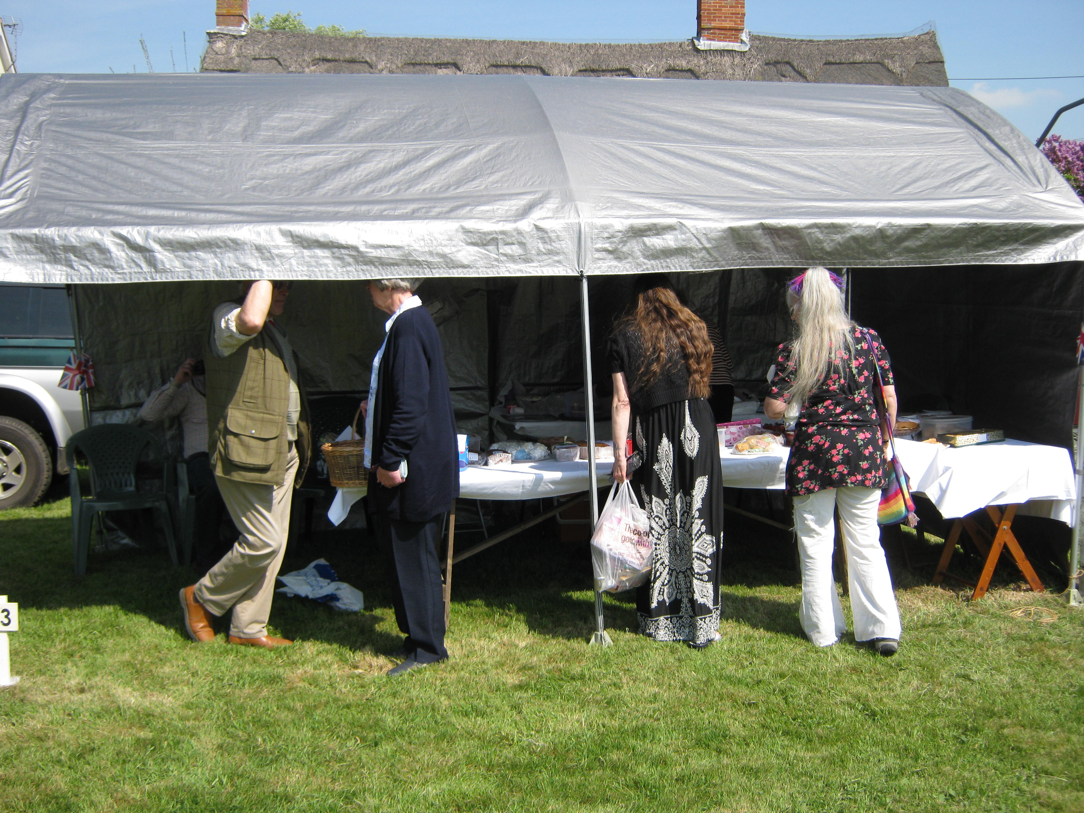 The tombola stall and a part of the cake stall on the left.  The white construction is the goal post without its net.