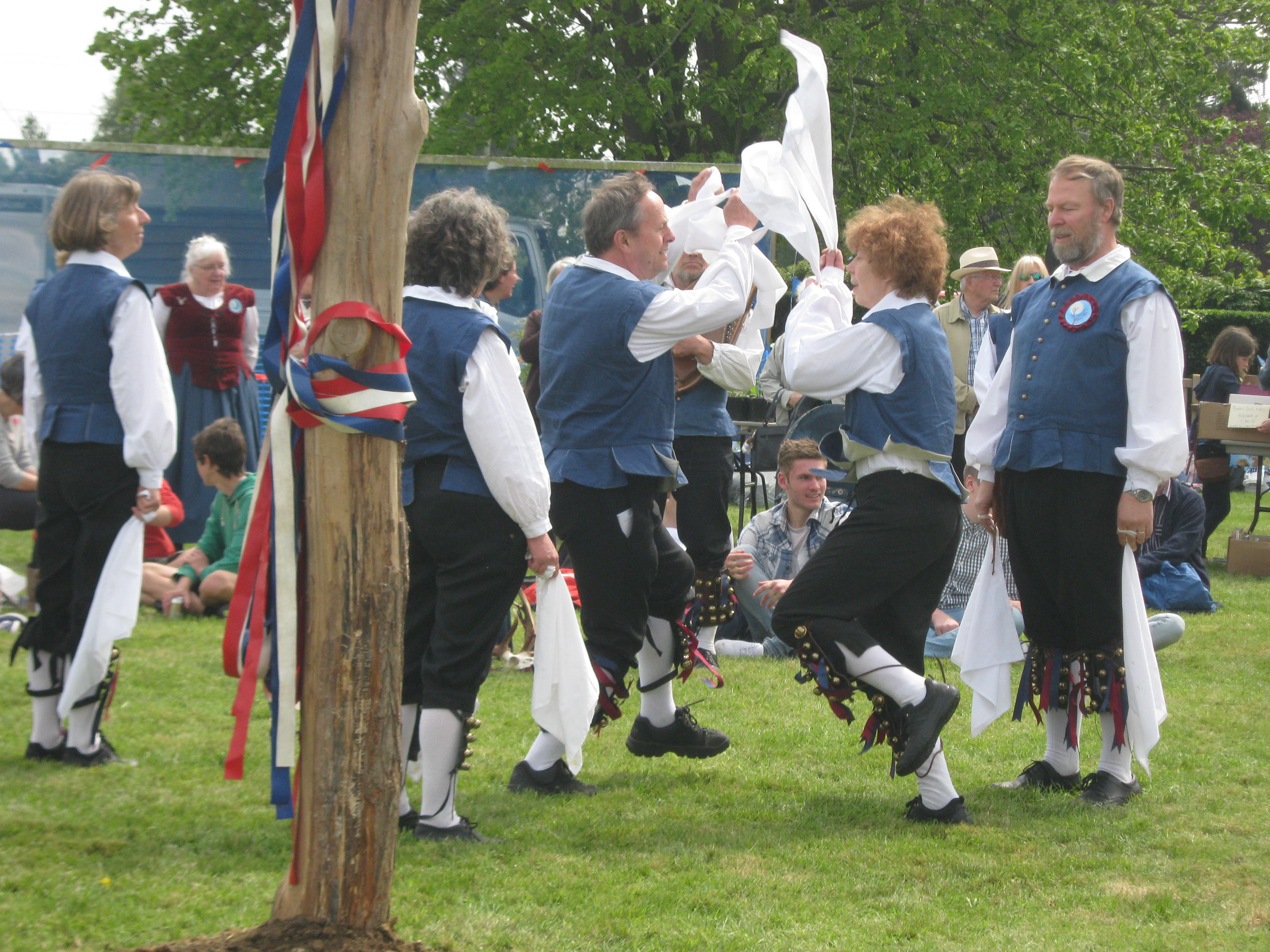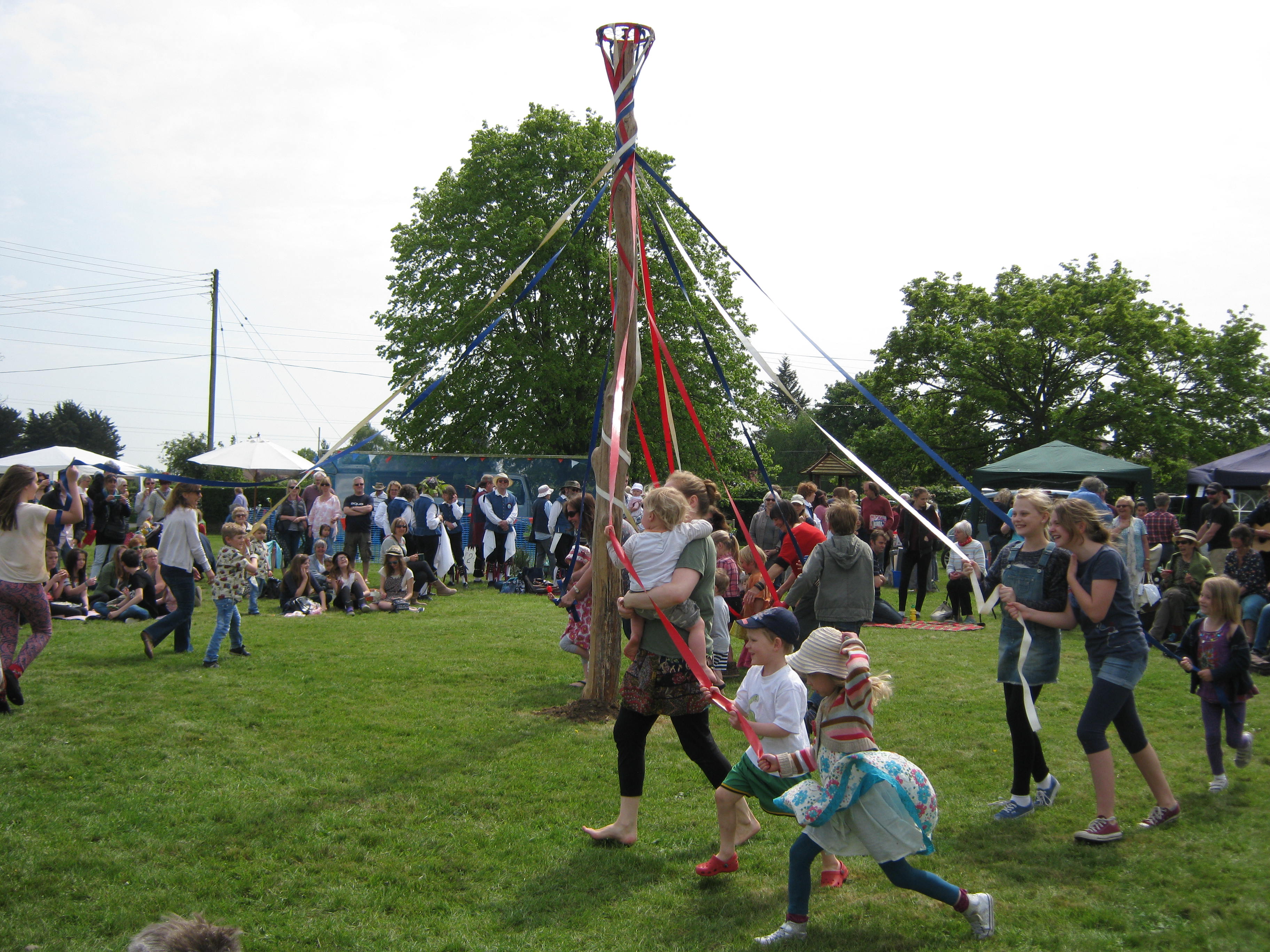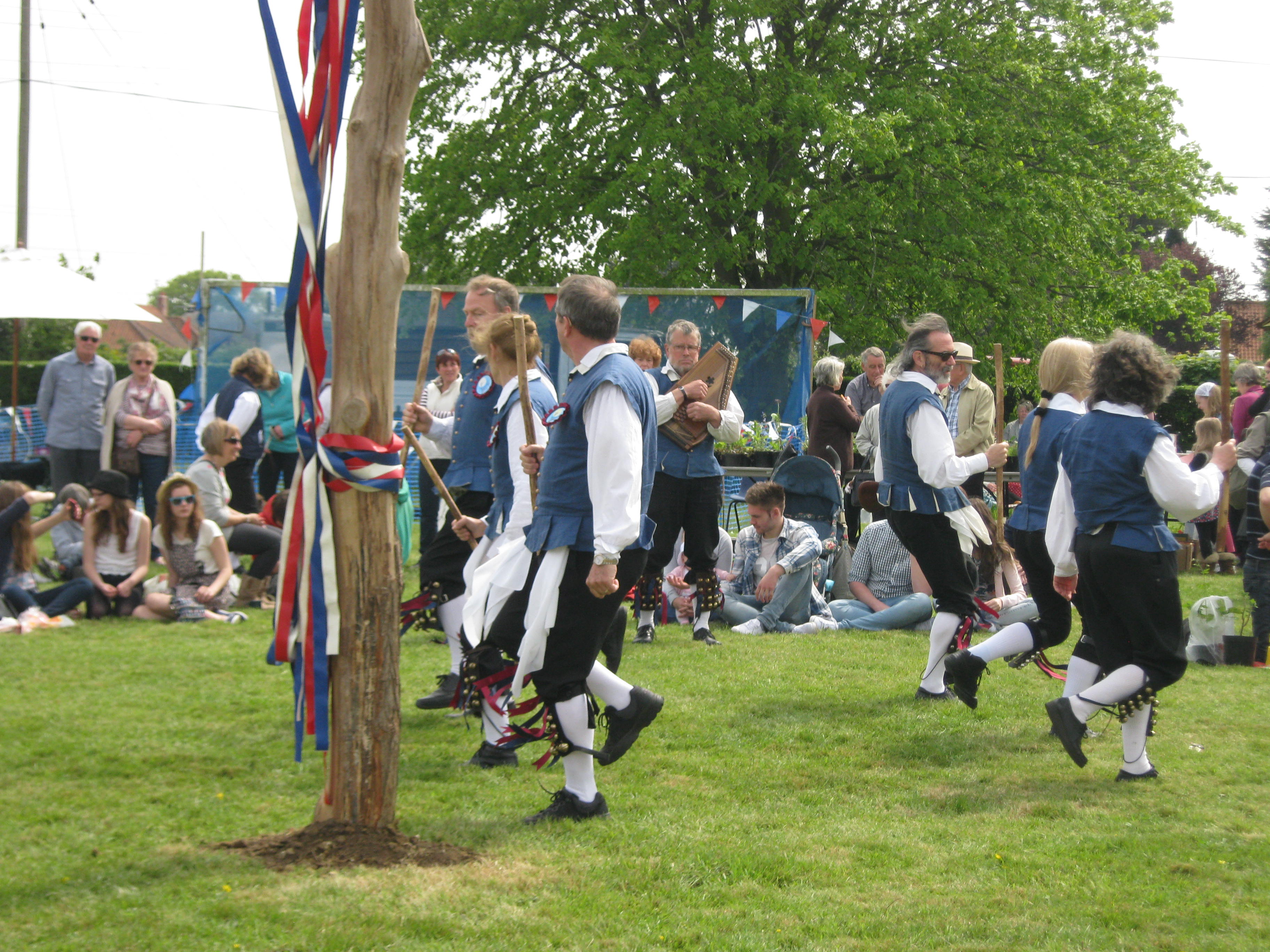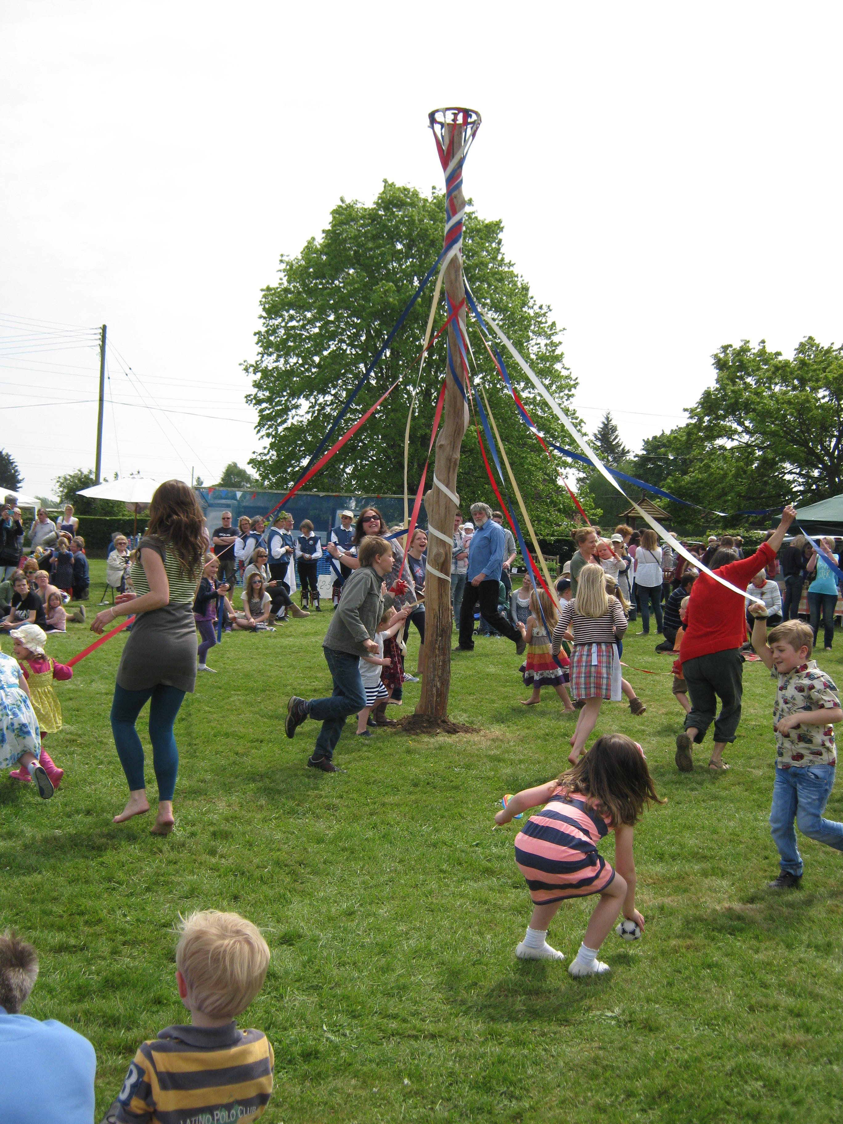 Dancing round the May Pole.  May Pole dancing isn’t taught any more so these young people hadn’t much idea what to do, but they all enjoyed themselves nevertheless.  R tells me he was taught how to dance round the May Pole at school.  When done properly it is really lovely.  The children weave in and out of each other, some going clockwise and some anti-clockwise.  The ribbons are all plaited together and then everything is reversed until all the ribbons are undone again.