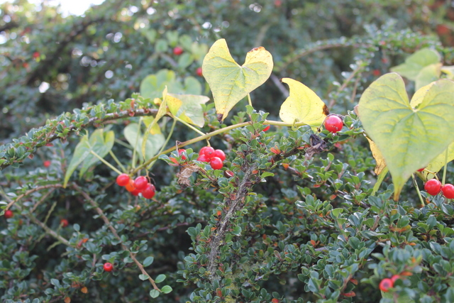 Black Bryony (Tamus communis) growing through Cotoneaster horizontalis