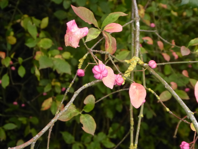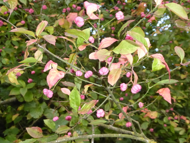 Spindle berries are bright pink and when ripe, split open to reveal orange-coloured seeds!