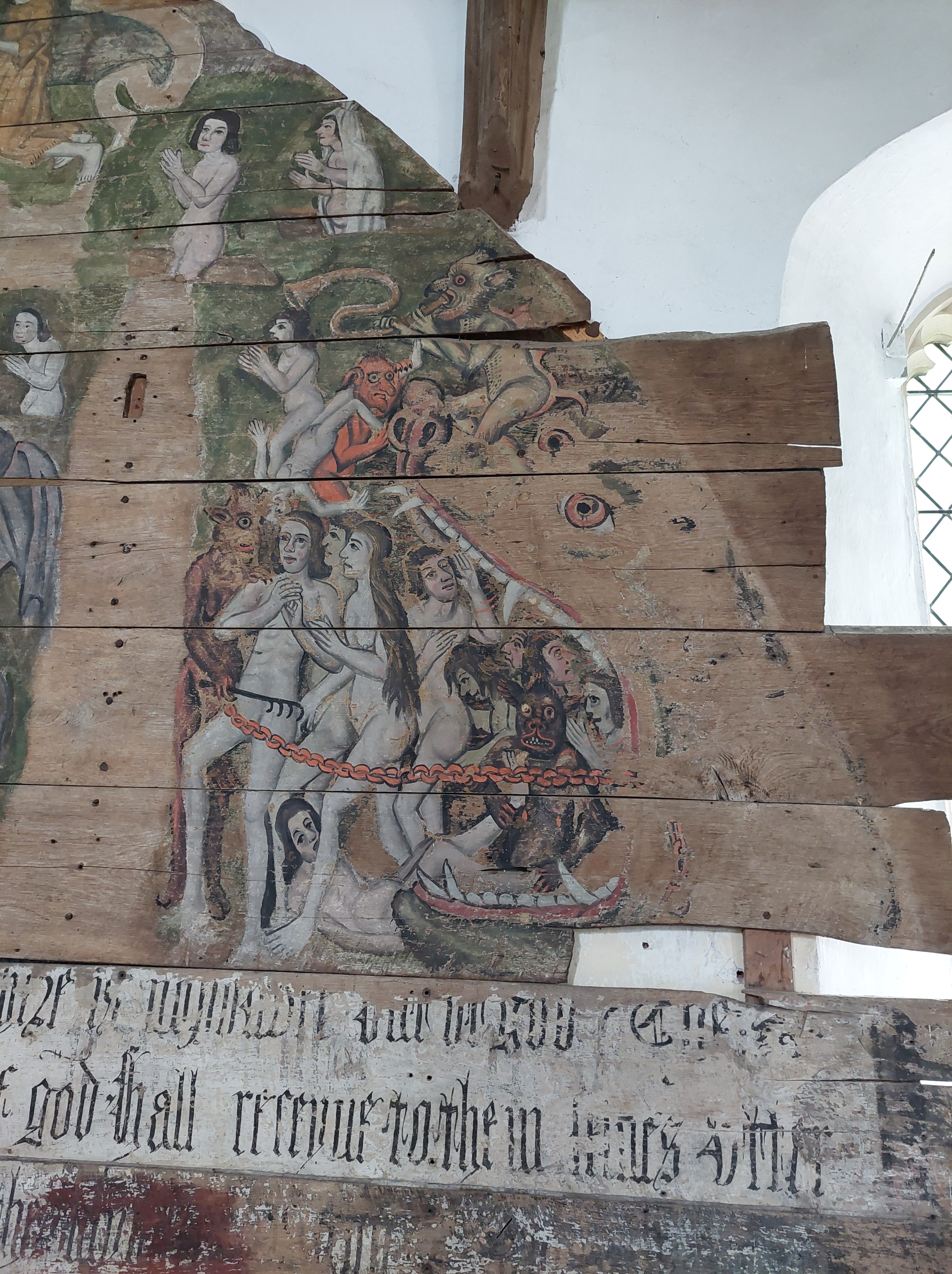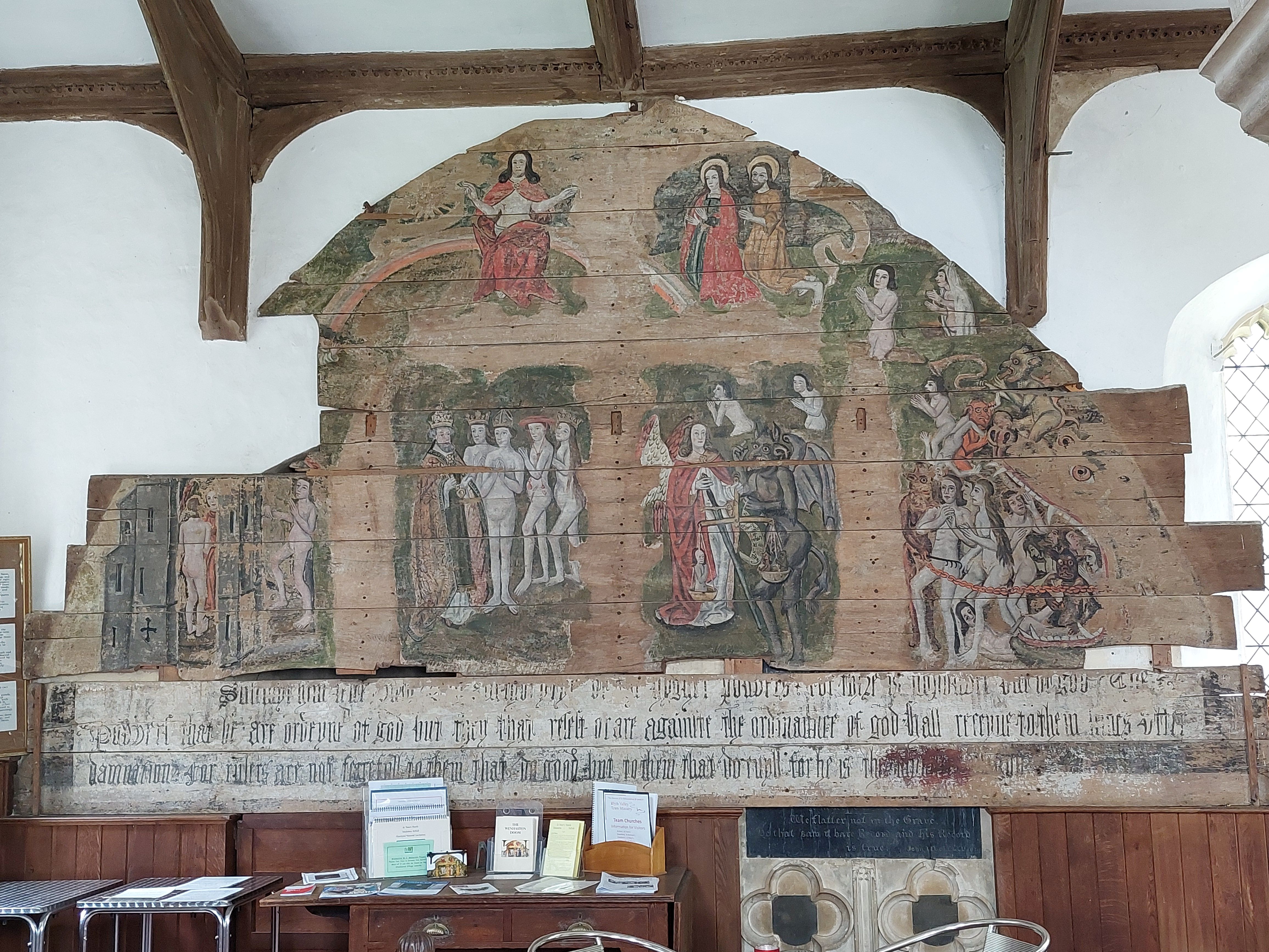 Elinor and I had come to see the church which is situated in the middle of the village.  It is referred to in the Domesday Book and part of it is of Saxon origin.  For many years it was looked after by Blythburgh Priory but like lots of churches in this country it suffered much during the reign of Edward VI and also during the Commonwealth of England under Oliver Cromwell.  William Dowsing‘s men visited in 1643 and according to the Wenhaston church guide book ‘did a lot of damage, breaking the stained glass, taking down the carved angels from the roof, removing the organ and the font cover, destroying the altar, hacking the pulpit about and much else besides’.  What they didn’t find was the Doom which the people of the parish had covered with whitewash many years earlier during Edward’s reign when he had demanded the destruction of all roods and the abolition of paintings and pictures in church.  For three centuries and more it stayed undiscovered and forgotten on the rood beam, whitewashed and painted over with passages from the Bible.