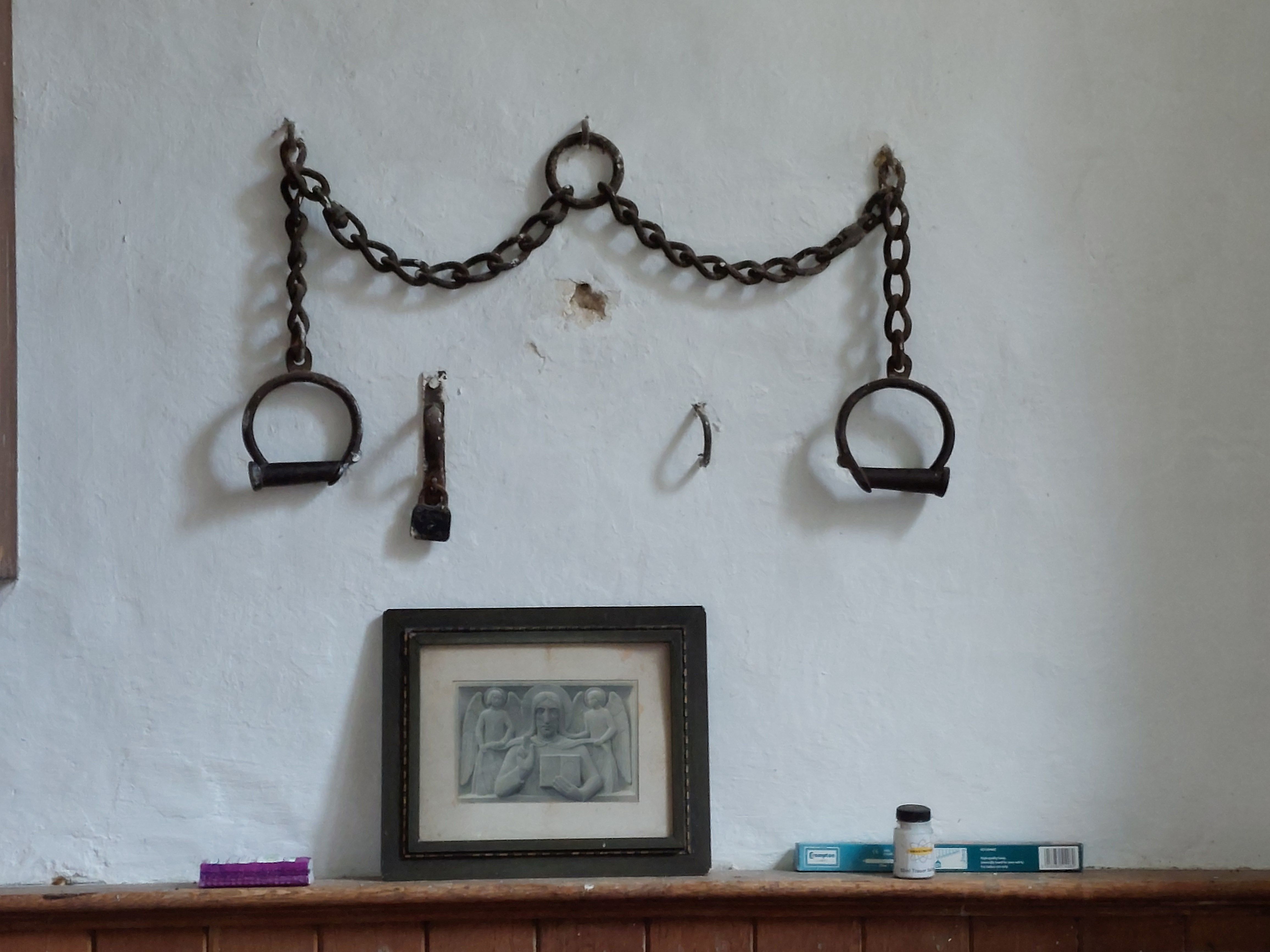 Here are the local Constable’s manacles for the stocks hanging up in the vestry. Redundant now of course, and there is no local constable any more either. I think that is a truncheon hanging there too!