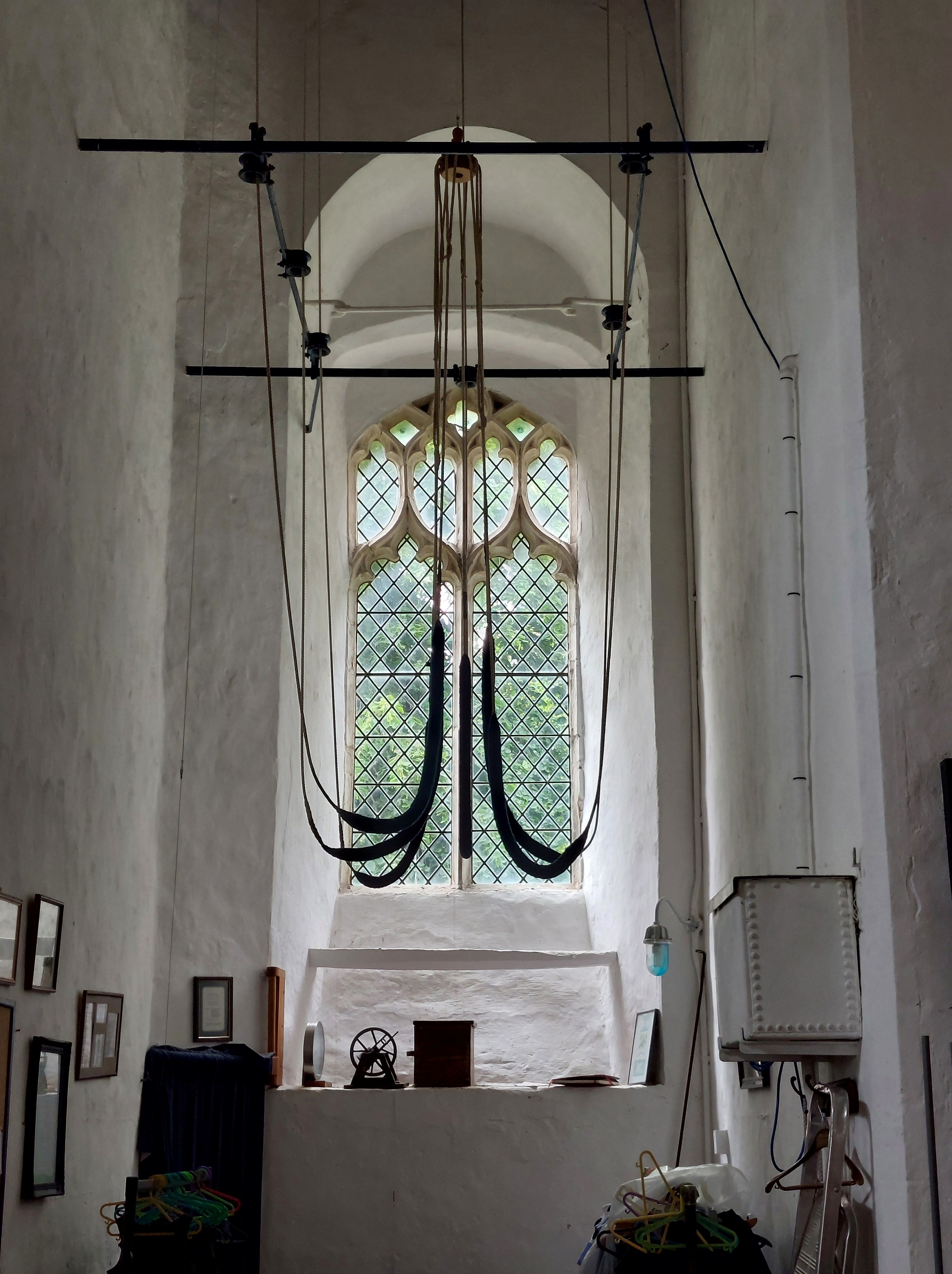 The bell-tower with the ropes lifted high, out of the reach of the hoi-polloi. There are six bells, two of which are medieval and probably came from Blythburgh Priory.