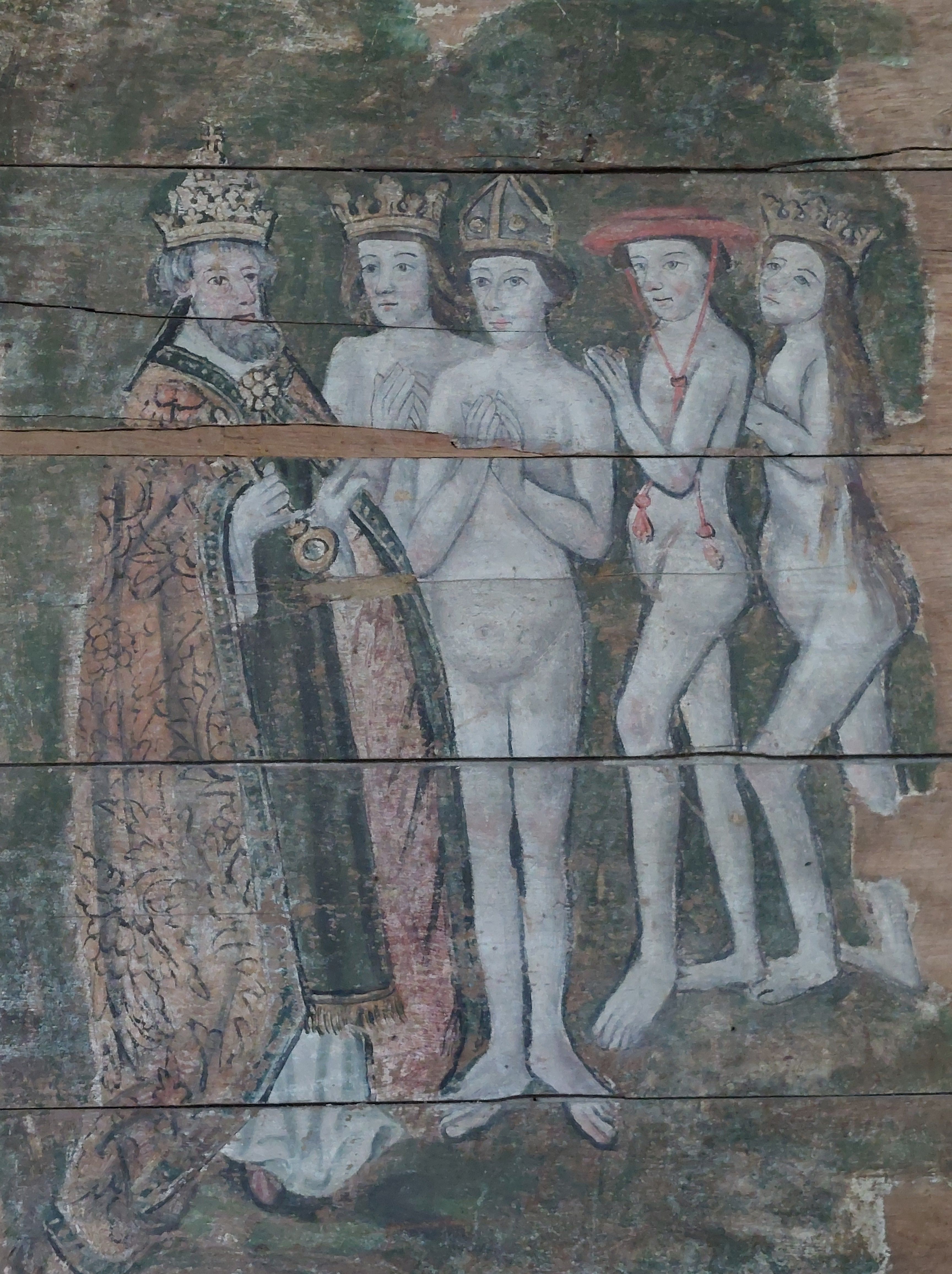 Beneath the image of Christ are the resurrected souls appearing above ground and their headgear – crowns, tiaras and mitres – have been included to show their station in life. Usually, the rich and powerful are seen mixing with ordinary mortals in Dooms to show equality on Judgement Day but in the Wenhaston Doom they are set apart for some reason.  Meeting them is St Peter in his papal tiara representing The Church which alone had the power to admit men and women to eternal life through the Sacraments.