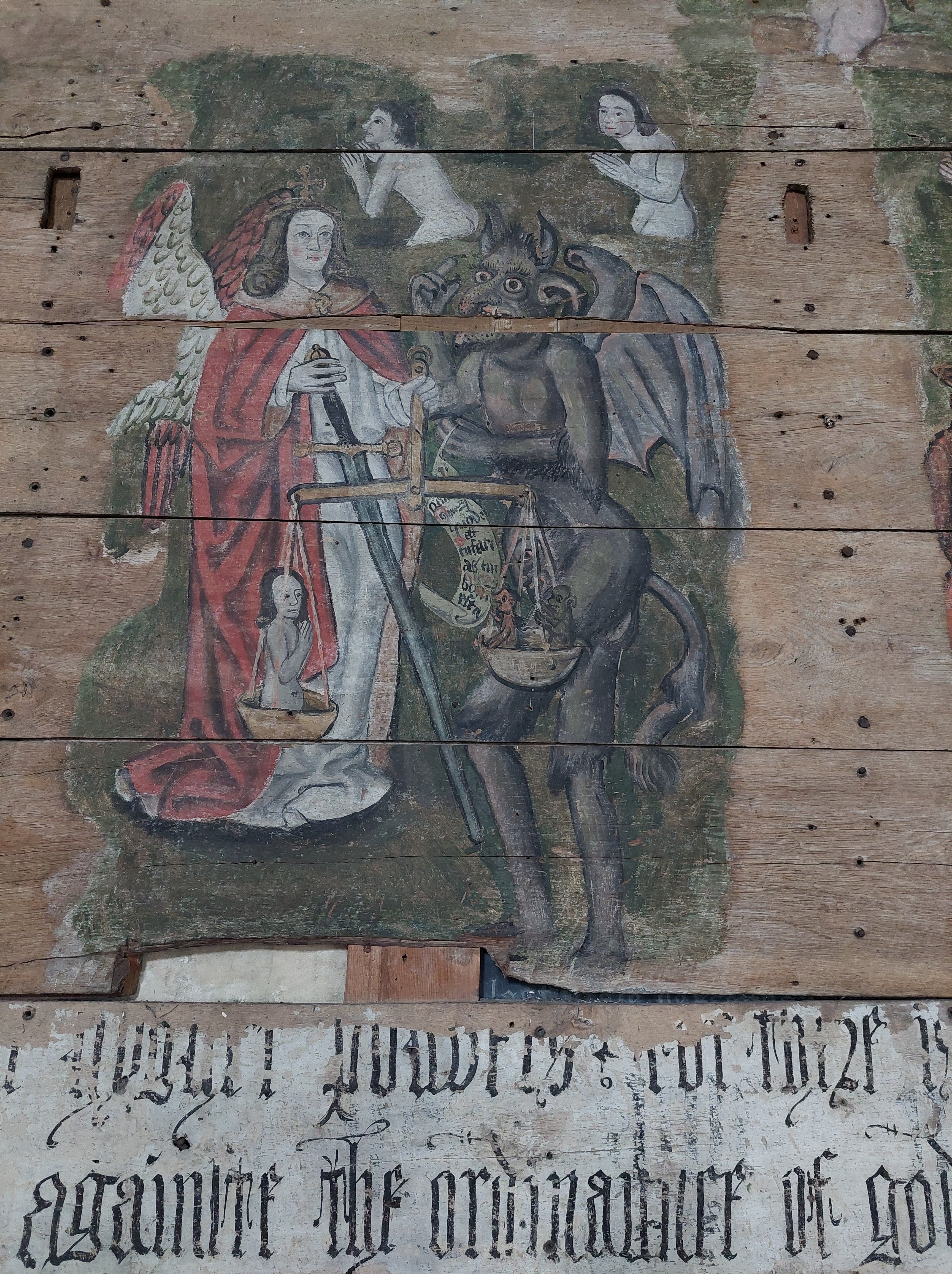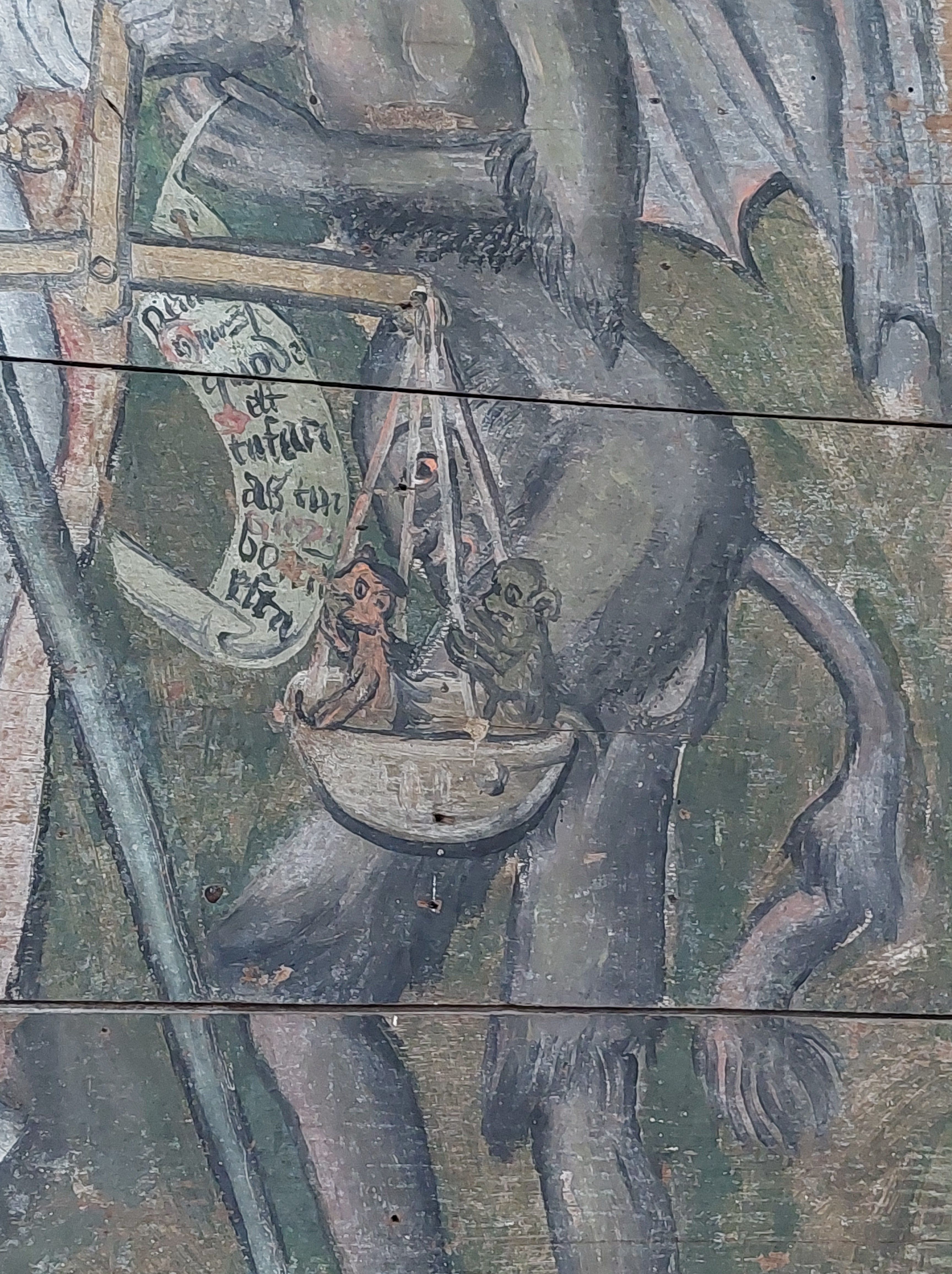The Devil is wearing ragged sleeves and trousers which, according to the guide book, suggests the outfit worn by the Devil when the Wenhaston actors visited the seaside village of Walberswick in the late 15th century.  The Walberswick churchwardens described the entertainment as the ‘Wenhaston game’.  There is a second face painted on the Devil’s belly.  This is an artistic convention often seen in late medieval painting which suggests that the Devil’s soul had been put at the service of his lower appetite and he was no better than a brute.  The Latin text says ‘N(unc) quo deest tu facias tabo amnesta – now for what is lacking may you give pardon for sin’.  This is for the benefit of these two (rather cute) little souls in the upper pan of the scales as they are weighed against the single pure soul in the lower pan.