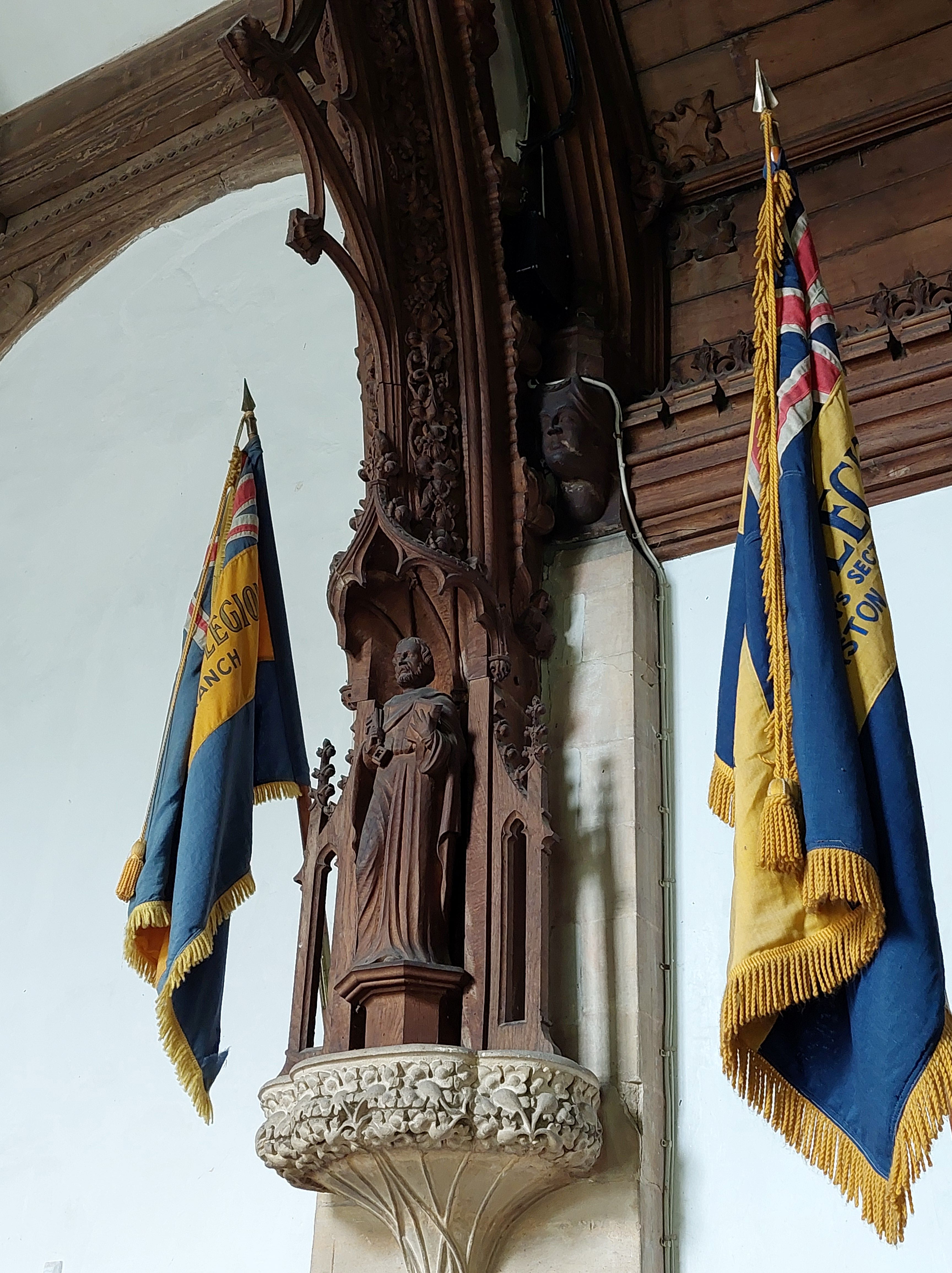 At the top of the Doom on the left is God as Christ seated on a rainbow and displaying His wounds.  At the top on the right are the Virgin Mary and St John the Baptist kneeling in prayer.  (Sadly my photograph of these two latter figures wasn’t good enough to show here).