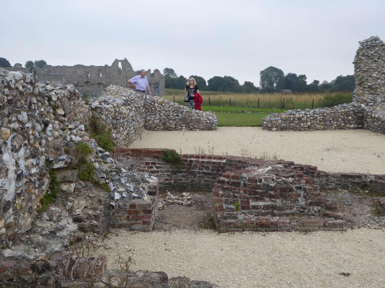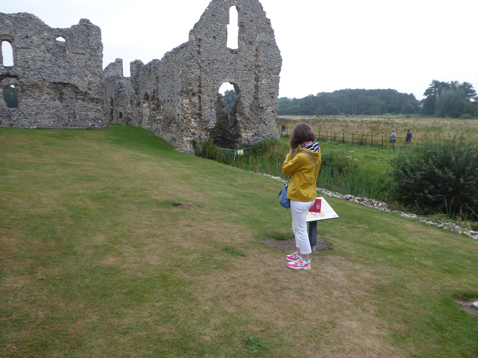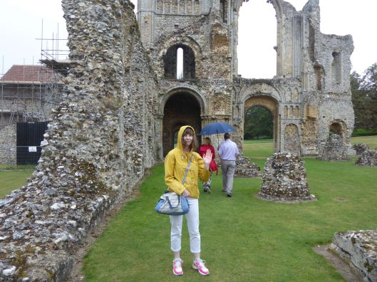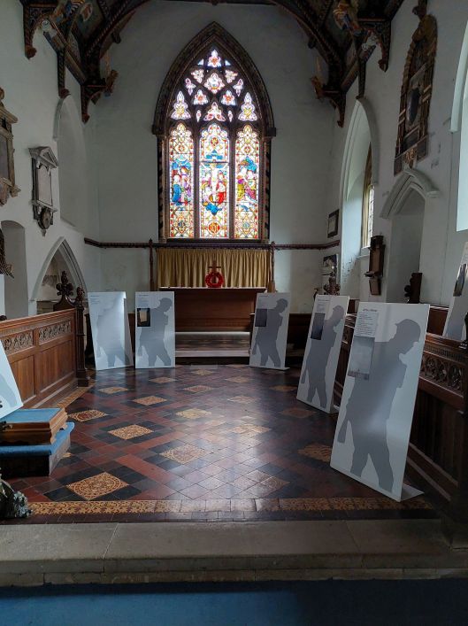 Elinor in her red hat contemplating the Doom. The wooden panelling you can see beyond her under the windows are the repurposed box pews.