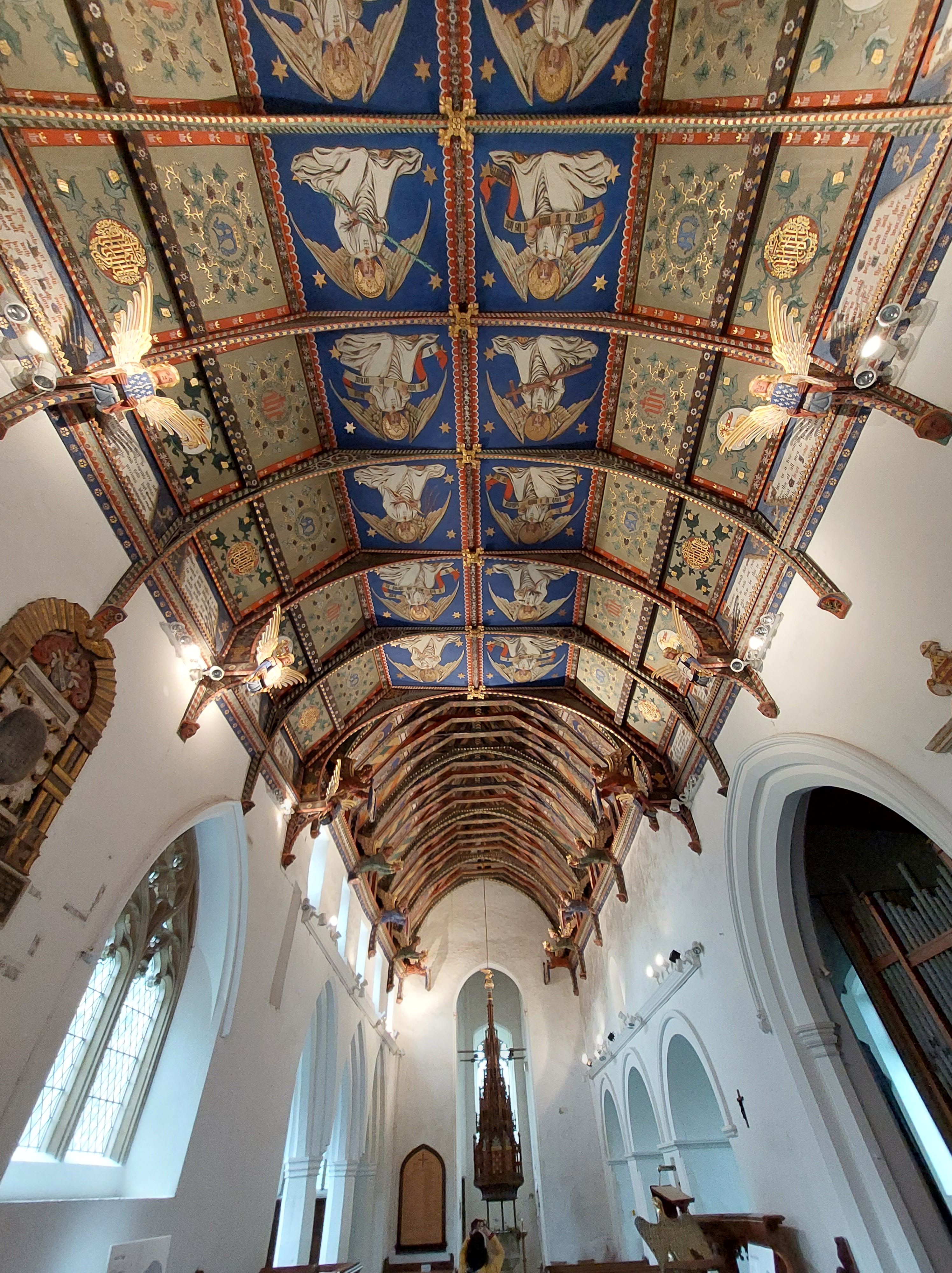 In 1892 the East end of the church was rebuilt. During the dismantling of the roof the rood beam was discovered intact and to still have its original paint and gilding. The whitewashed Doom was removed plank by plank and thrown out into the churchyard for later destruction. Fortunately, it rained heavily during that night and in the morning the painting underneath was beginning to emerge from under the whitewash. The whole Doom was cleaned and experts were called in to assess its provenance. The Doom was put on display and people paid to see it; the proceeds of which helped to pay for the rebuilding of the roof and the church was then able to get even more repairs done. The new chancel arch was too narrow for the Doom to be replaced in its old position so for a while it was put on the West wall of the church where there was a gallery. The gallery was removed in 1927 so that the Doom could be seen more easily and sometime later the Doom was placed where it is now on the North wall.