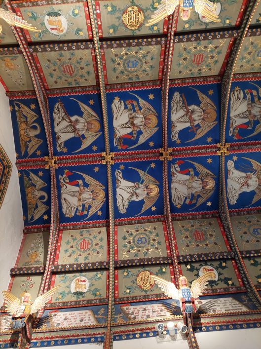 At the top of the Doom on the left is God as Christ seated on a rainbow and displaying His wounds. At the top on the right are the Virgin Mary and St John the Baptist kneeling in prayer. (Sadly my photograph of these two latter figures wasn’t good enough to show here).