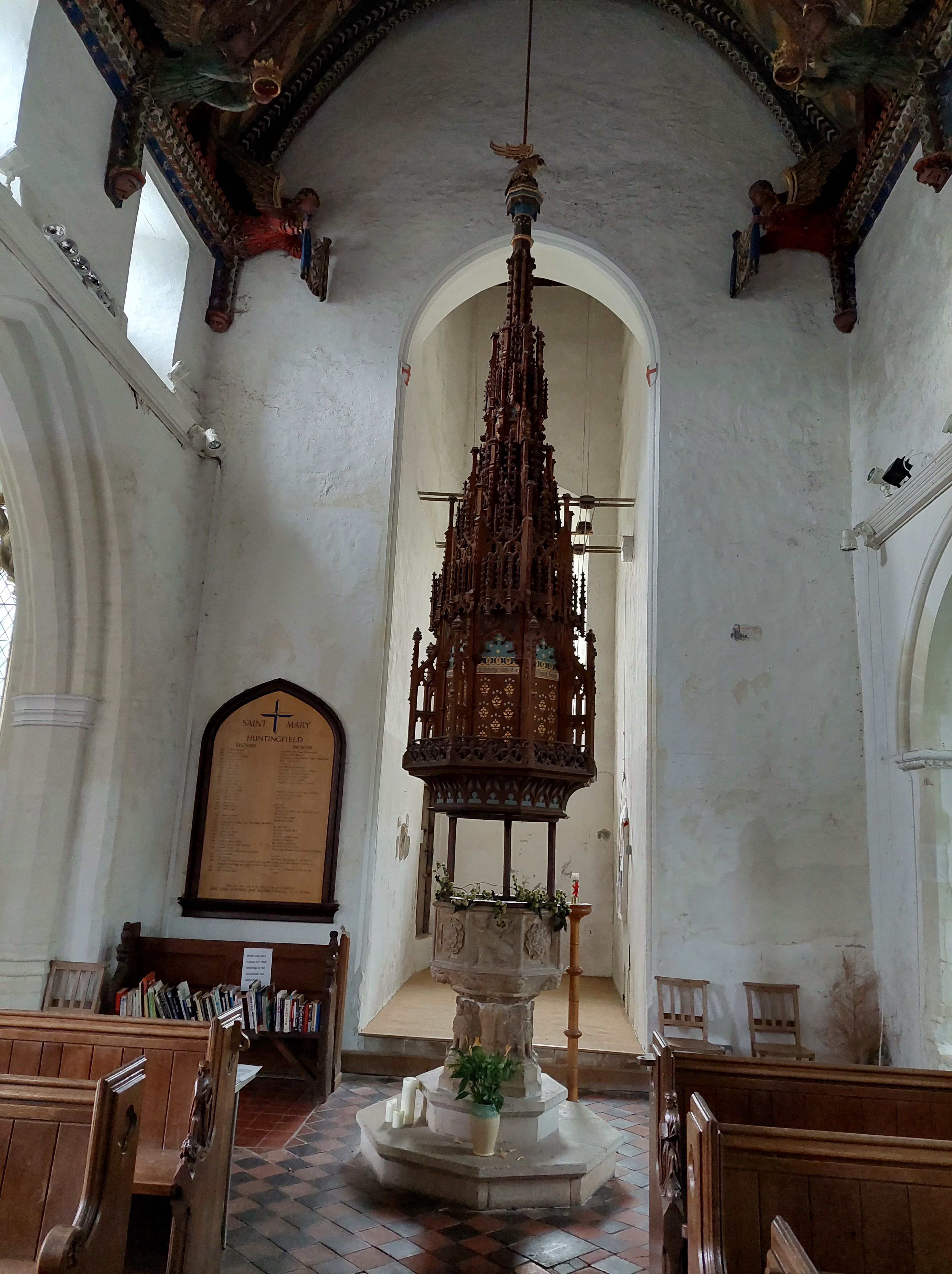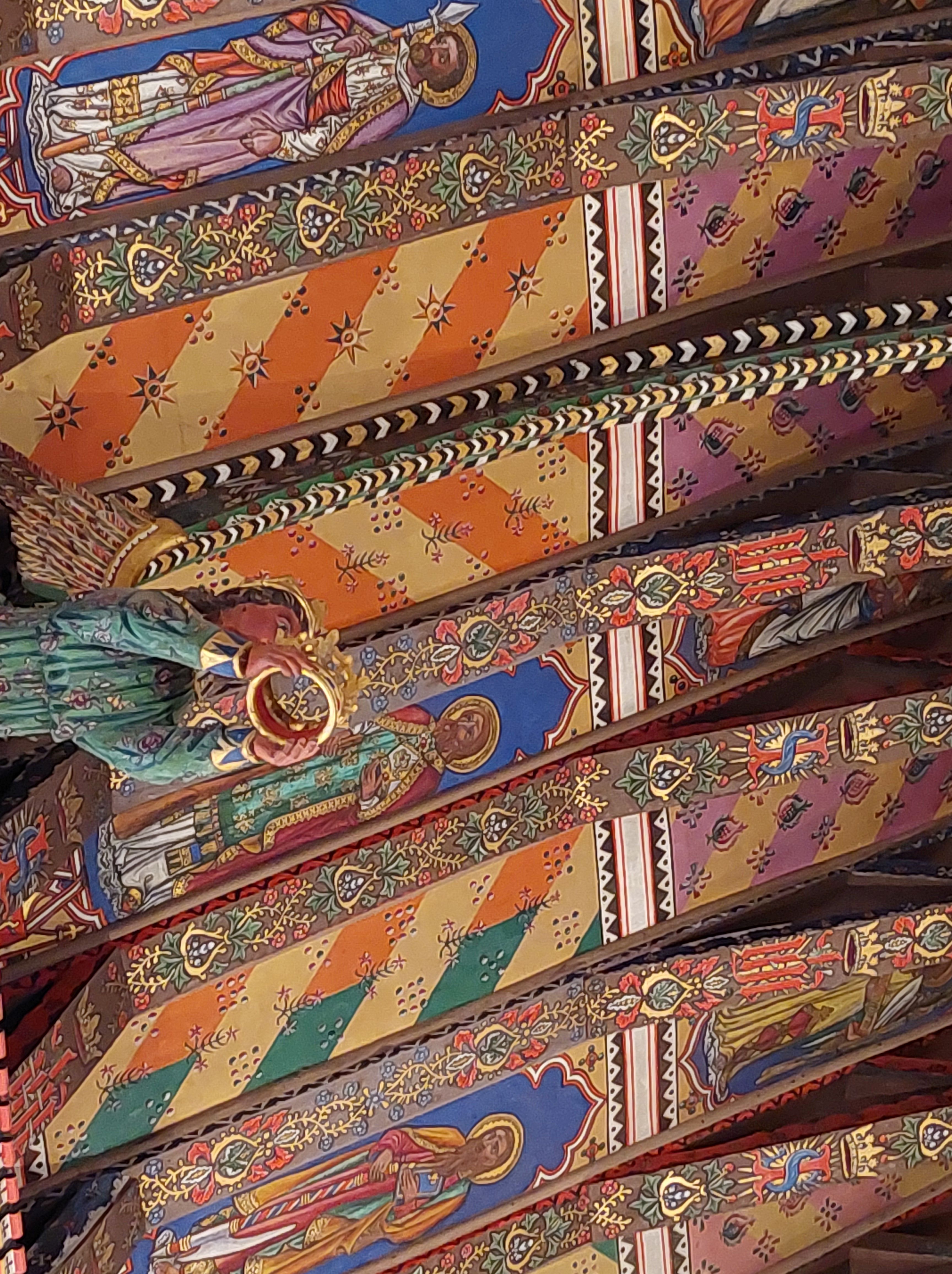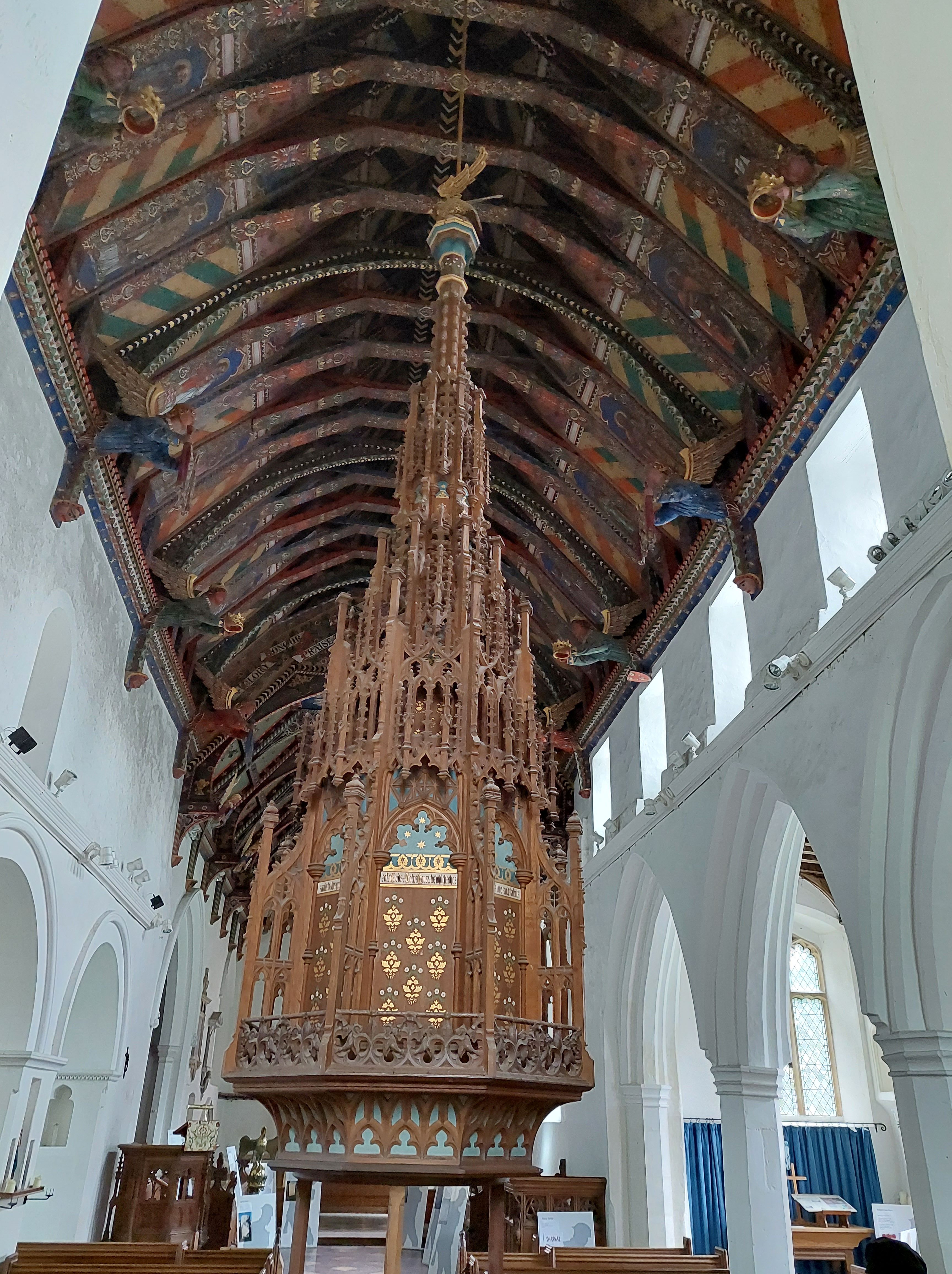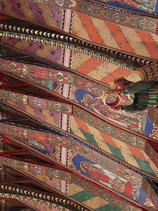Elinor and I had come to see the church which is situated in the middle of the village. It is referred to in the Domesday Book and part of it is of Saxon origin. For many years it was looked after by Blythburgh Priory but like lots of churches in this country it suffered much during the reign of Edward VI and also during the Commonwealth of England under Oliver Cromwell. William Dowsing‘s men visited in 1643 and according to the Wenhaston church guide book ‘did a lot of damage, breaking the stained glass, taking down the carved angels from the roof, removing the organ and the font cover, destroying the altar, hacking the pulpit about and much else besides’. What they didn’t find was the Doom which the people of the parish had covered with whitewash many years earlier during Edward’s reign when he had demanded the destruction of all roods and the abolition of paintings and pictures in church. For three centuries and more it stayed undiscovered and forgotten on the rood beam, whitewashed and painted over with passages from the Bible.