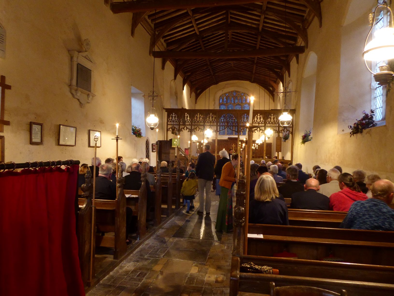The Doom is a representation of the Last Judgement. It was probably painted in about 1520 or just before then, the date partly based on the style of the Virgin Mary’s bodice as depicted in the Doom. The villagers had started saving for the work to be done during the 1480’s. Dooms were usually placed on the chancel arch which separates the Nave where the common people worship – the Church Militant – and the Chancel, where the priests lead the worship – the Church Triumphant. A rood screen was often placed at the chancel arch, which added to the seclusion of the chancel, and the sculpted or carved figures of Our Lord on the Cross with the Virgin Mary on one side and St John the Baptist on the other were placed on the top of the rood beam. In this church the figures of the rood were attached to the Doom. The figures have long since disappeared but their position and shape can be seen by the blank spaces on the Doom painting.