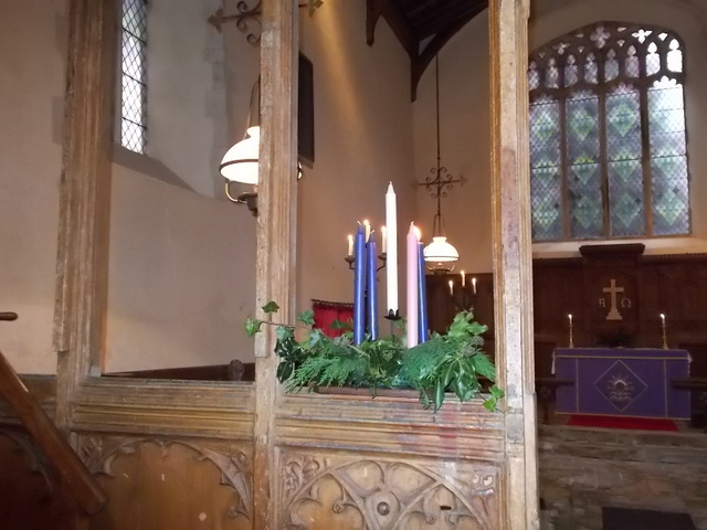 The Advent Crown that I helped assemble with its first candle burning. This photo was taken in our church at Rumburgh on Sunday morning.
