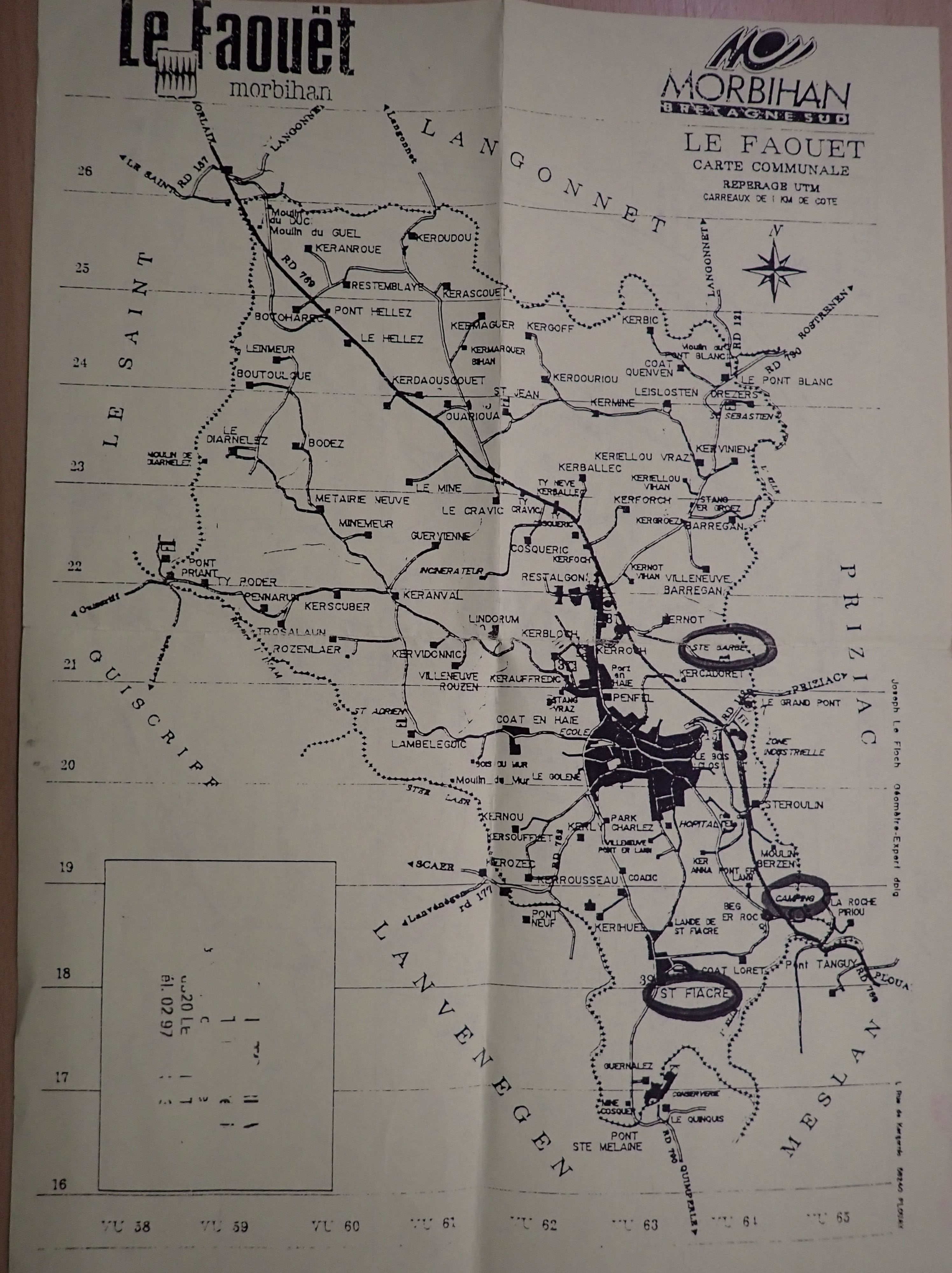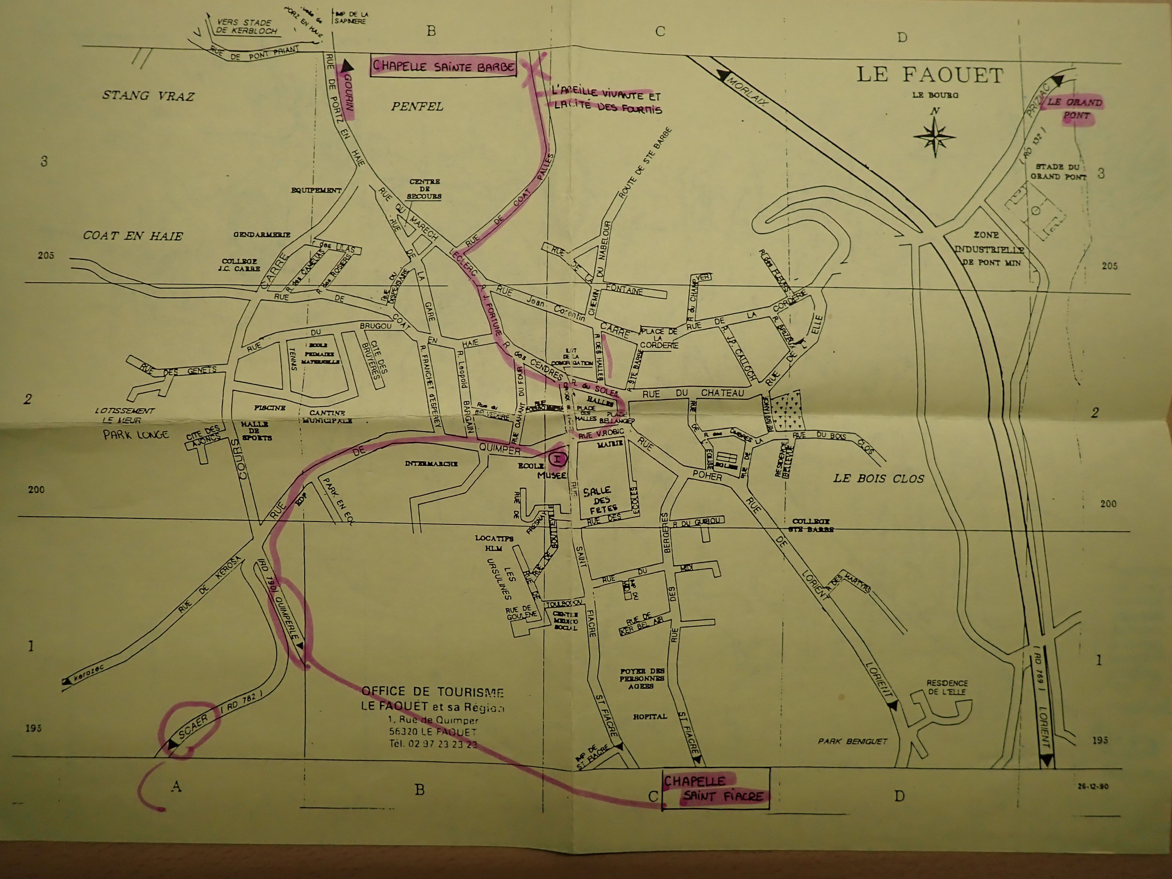 Thanks to orangesmile.com for the map. This is a map of Brittany and St Malo is at the top right of the map. Le Faouët is at D5.