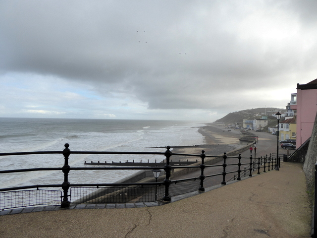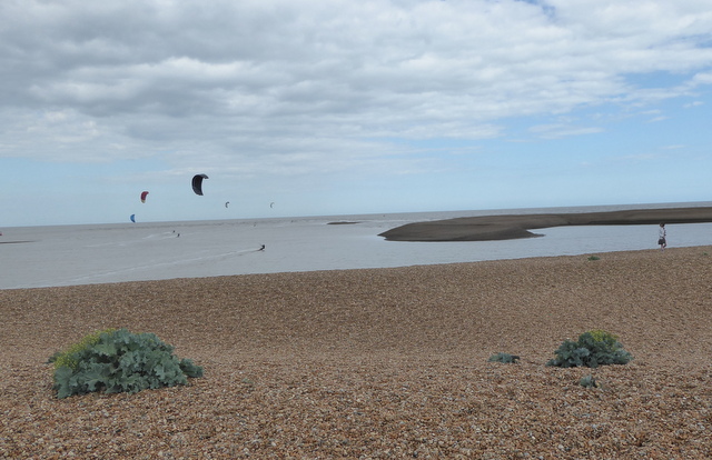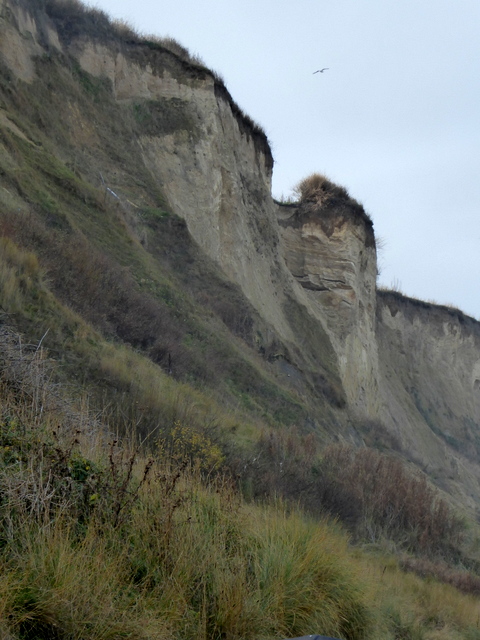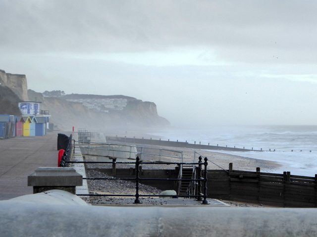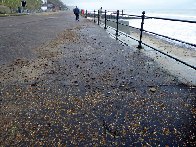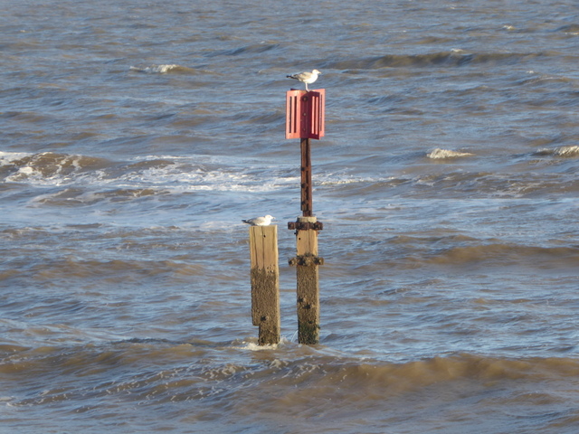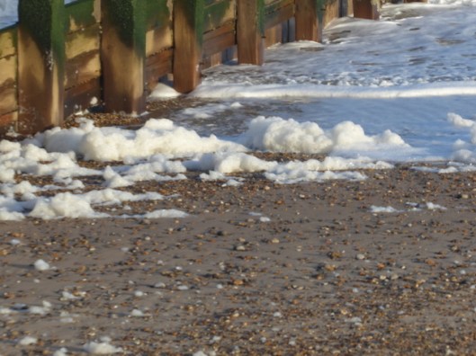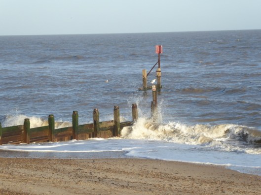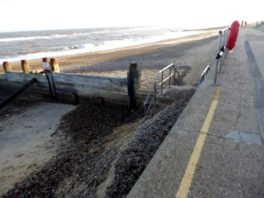 We noticed quite a large piece of driftwood had been thrown up by the sea next to the groyne. If you look closely you will see that it is part of the trunk of a long-dead tree. The woman in the ochre-yellow coat has her hood up against the blast of the wind. We too, had our winter coats on and hoods up!