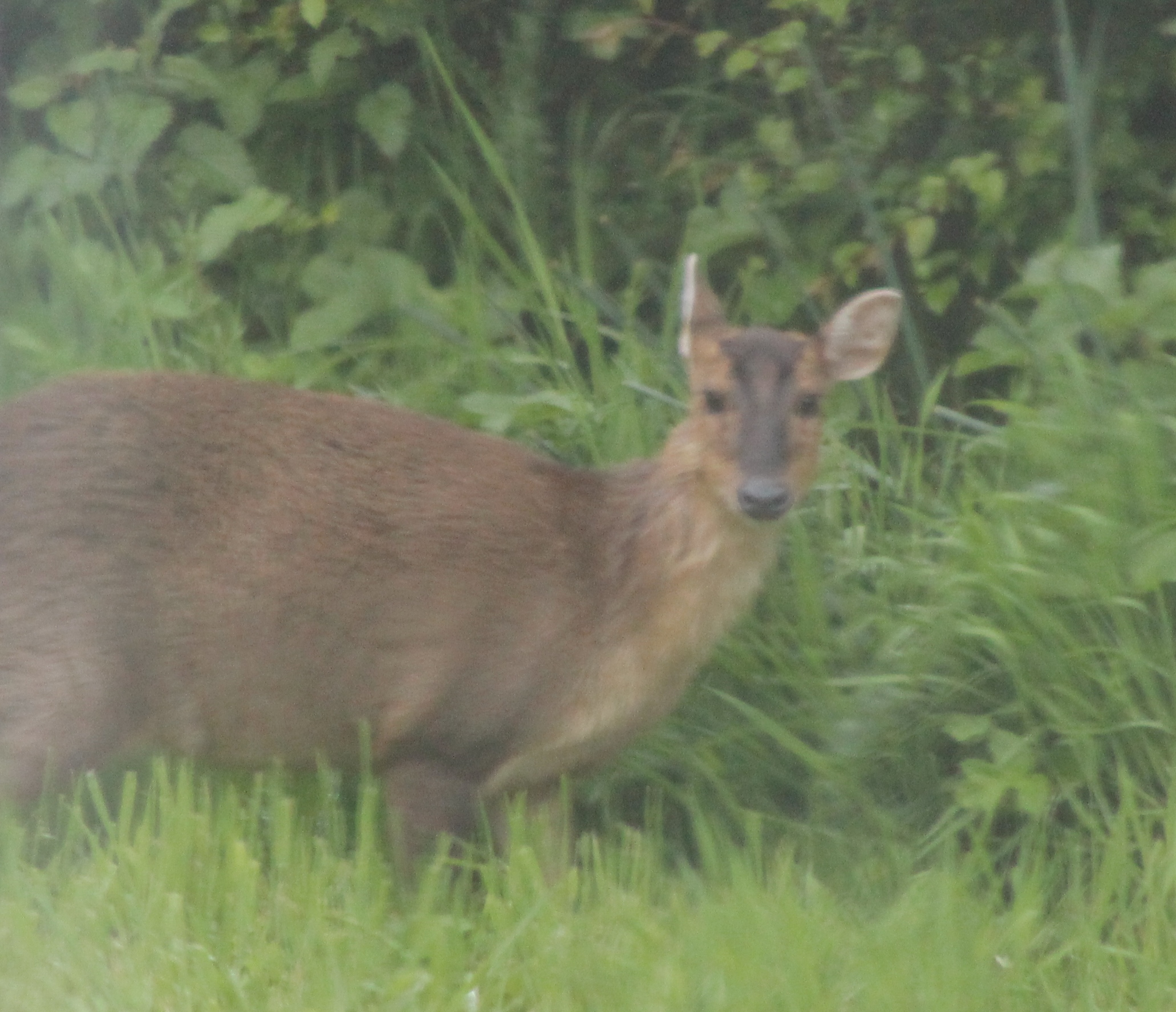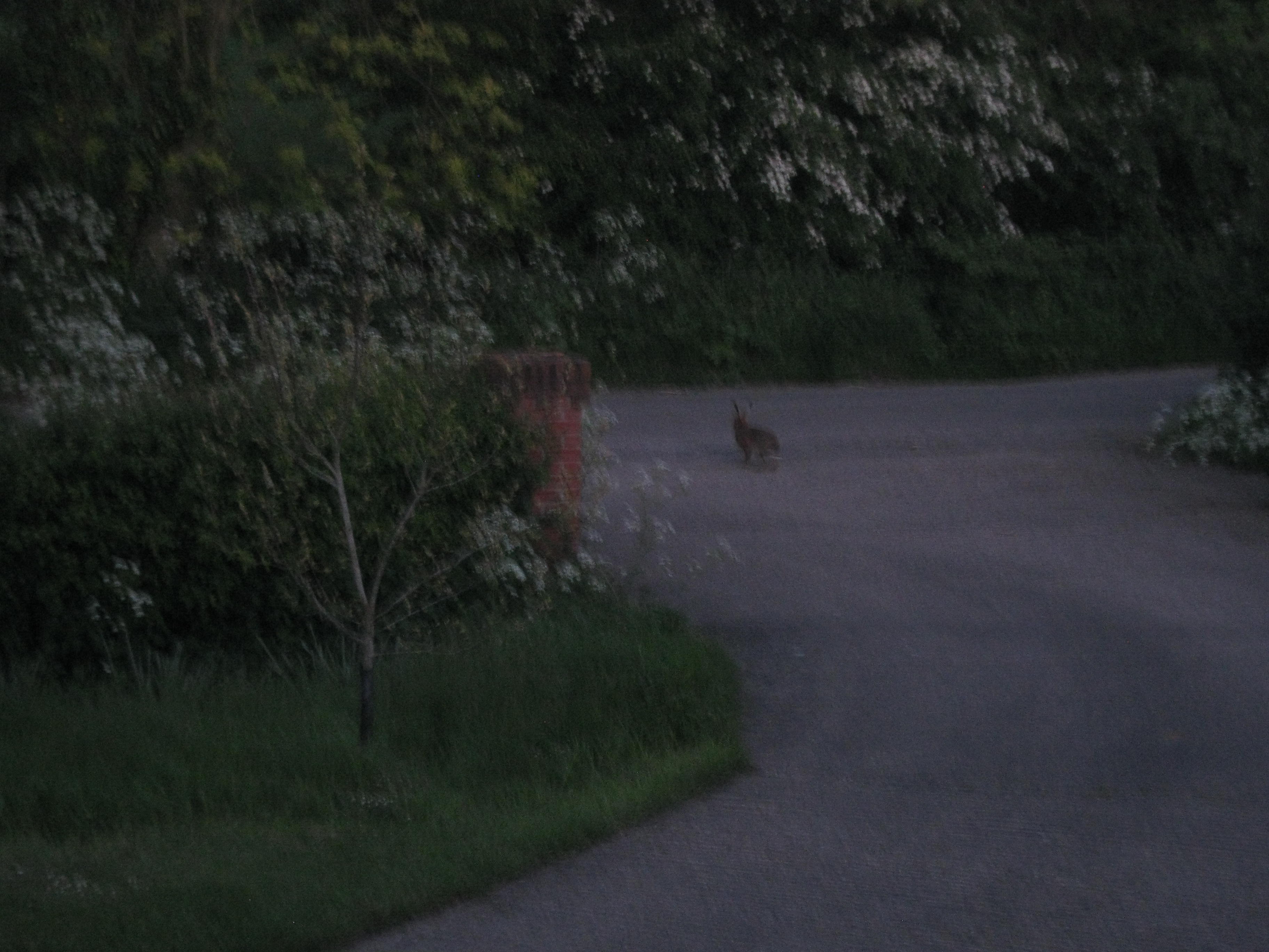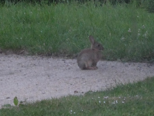 I took this picture with my smaller camera from the utility room window and you can see how damp with dew everything was, including the leveret. It stayed with us for a few days, hardly ever moving from its ‘form’, the nest in the grass it had made for itself.