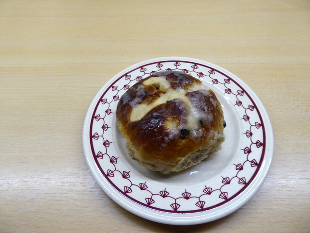 One of my mother’s excellent Hot Cross Buns. They are split, toasted and then buttered.
