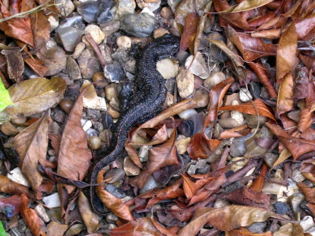 When I moved my wheelie-bin full of rubbish from it’s spot near the house in order to take it to the end of the drive for emptying, I saw this creature had been hiding underneath. It obligingly waited while I ran into the house to collect my camera. Great Crested Newts are a protected species throughout Europe as they are becoming quite rare through loss of habitat. If this is a Great Crested ( or Great Northern or Warty) Newt, and I suspect that it is, we will have to be very careful how and when we do any pond maintenance.