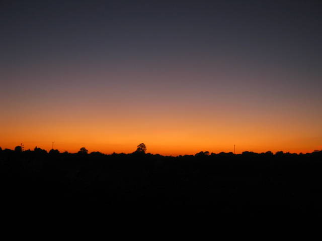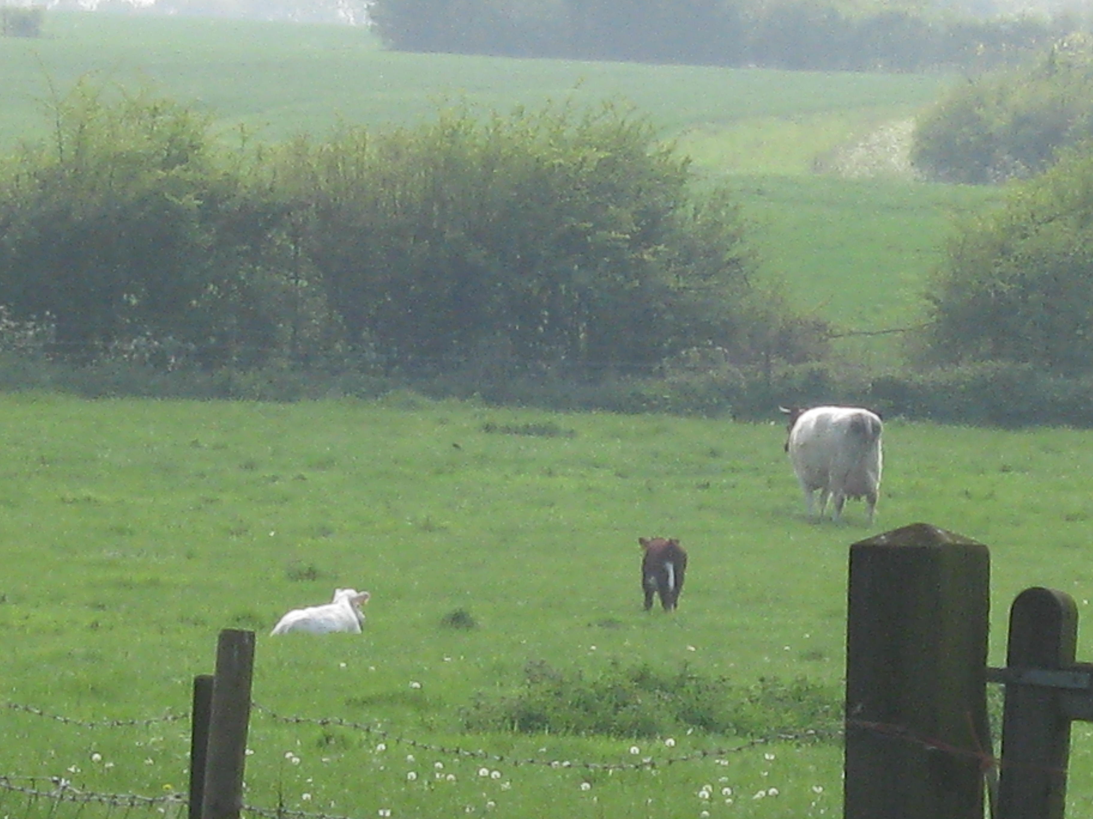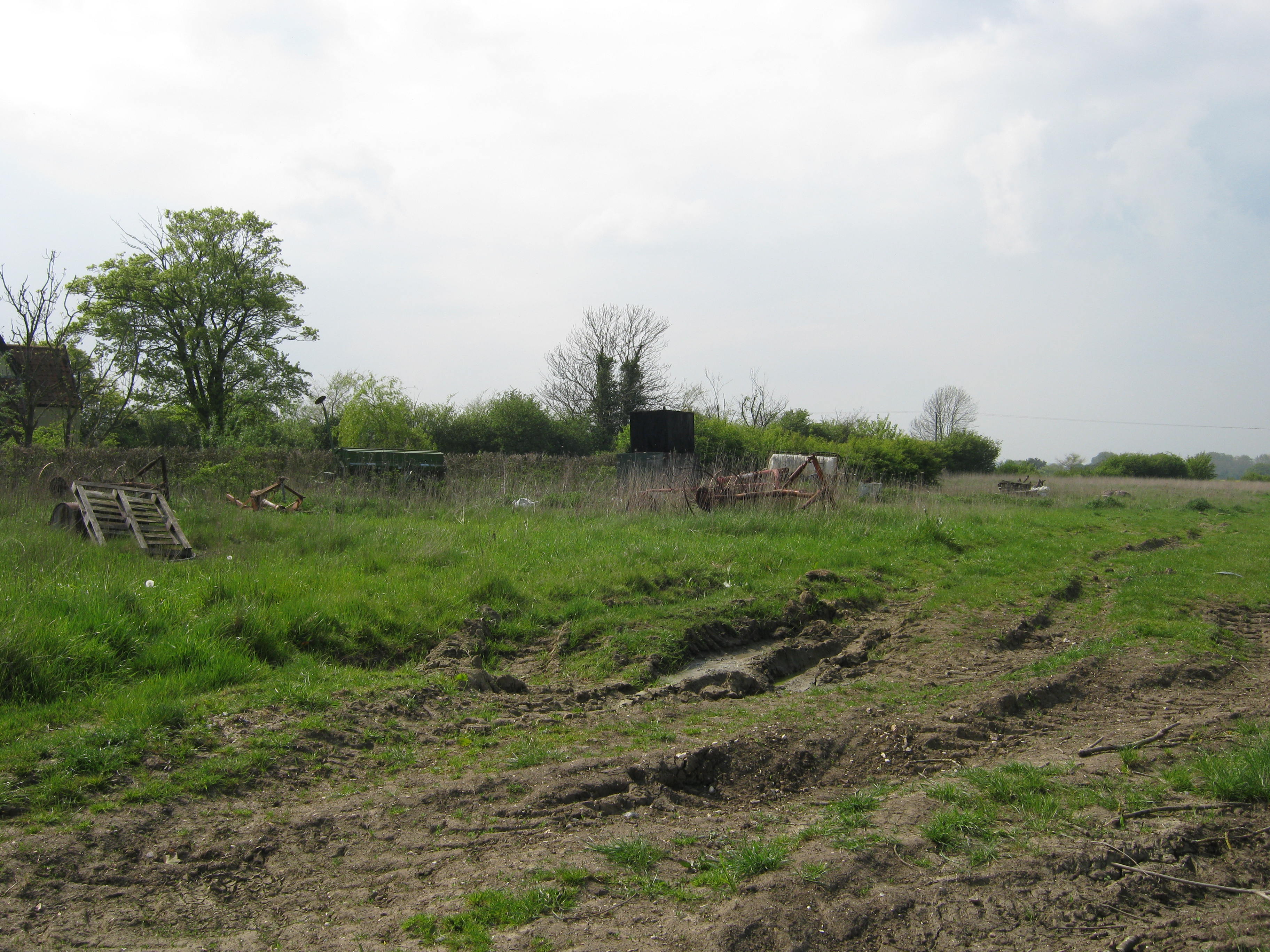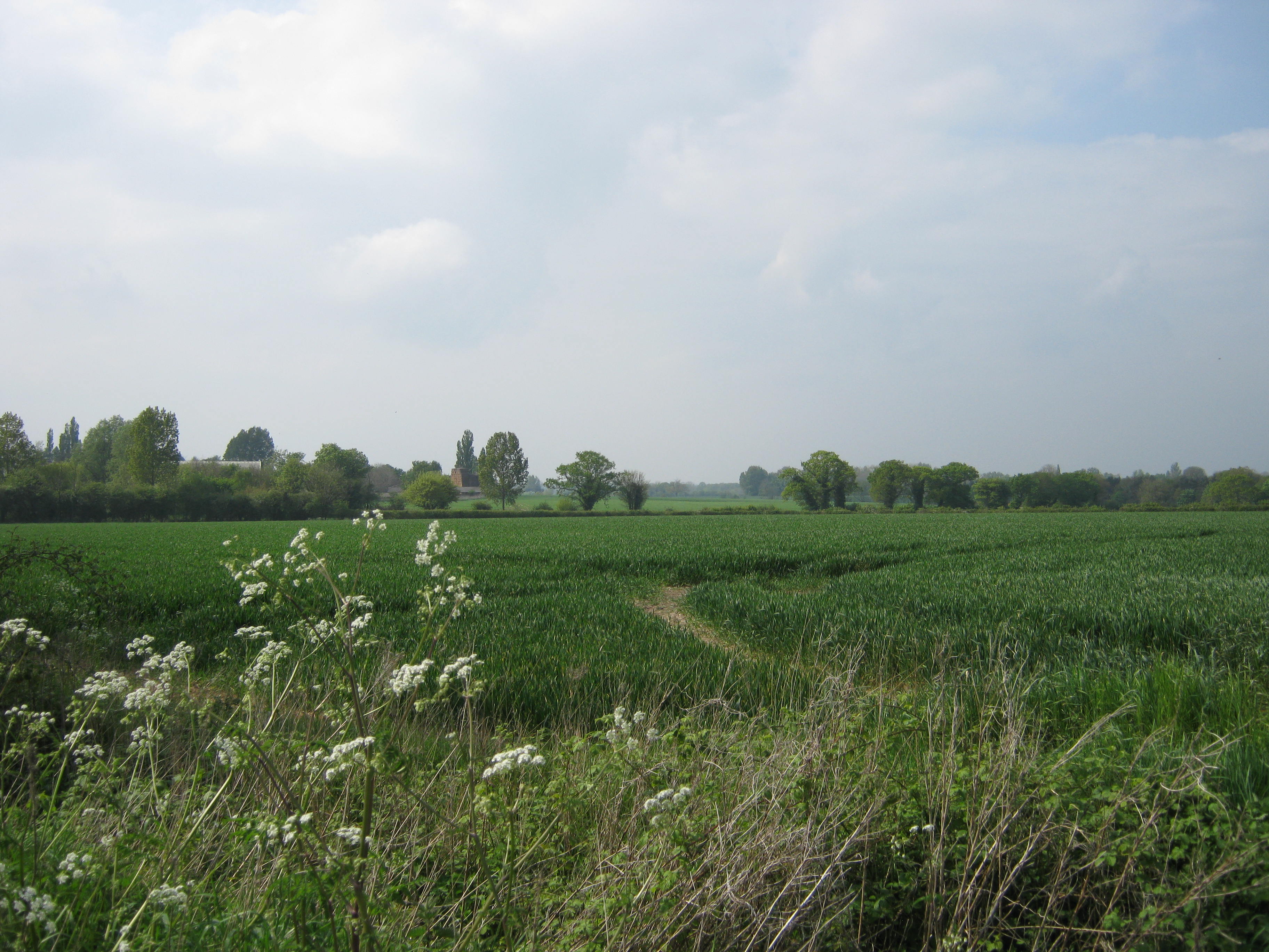 A view over the hedge to the fields beyond. The skies were clearing.
