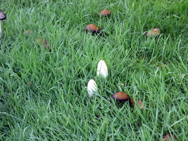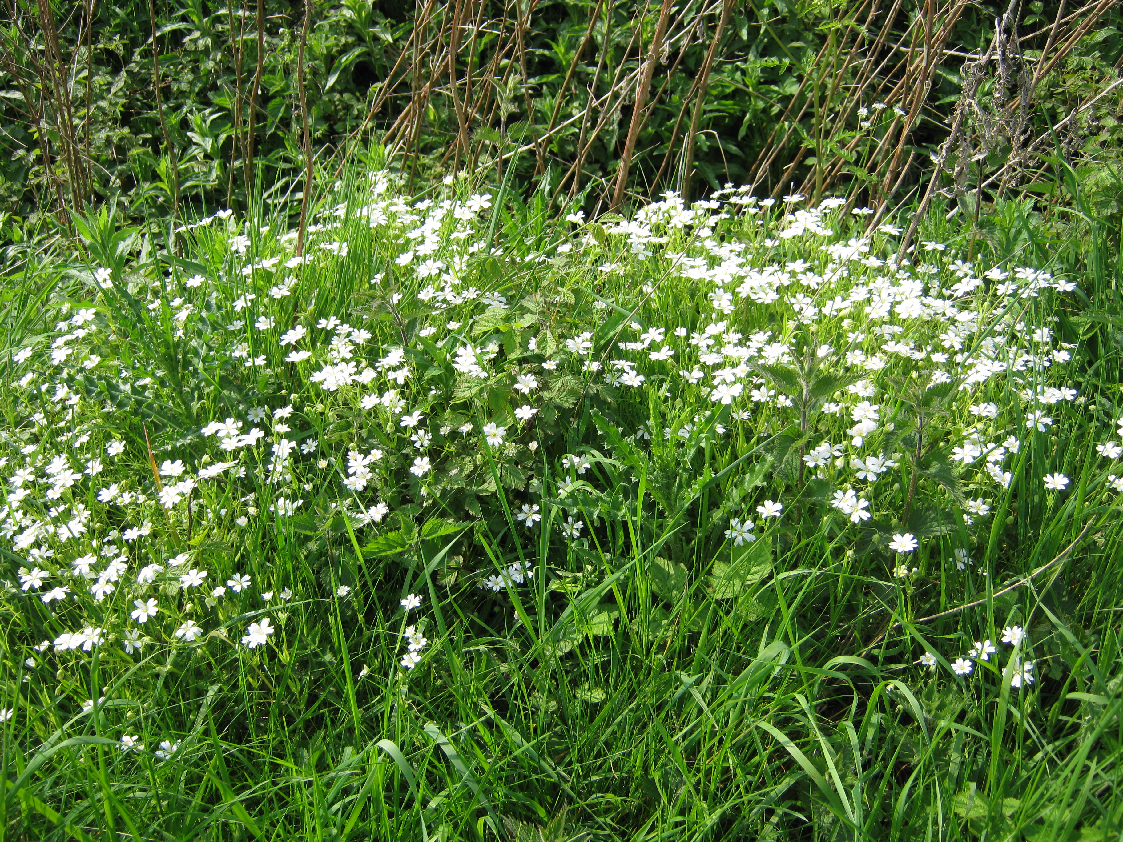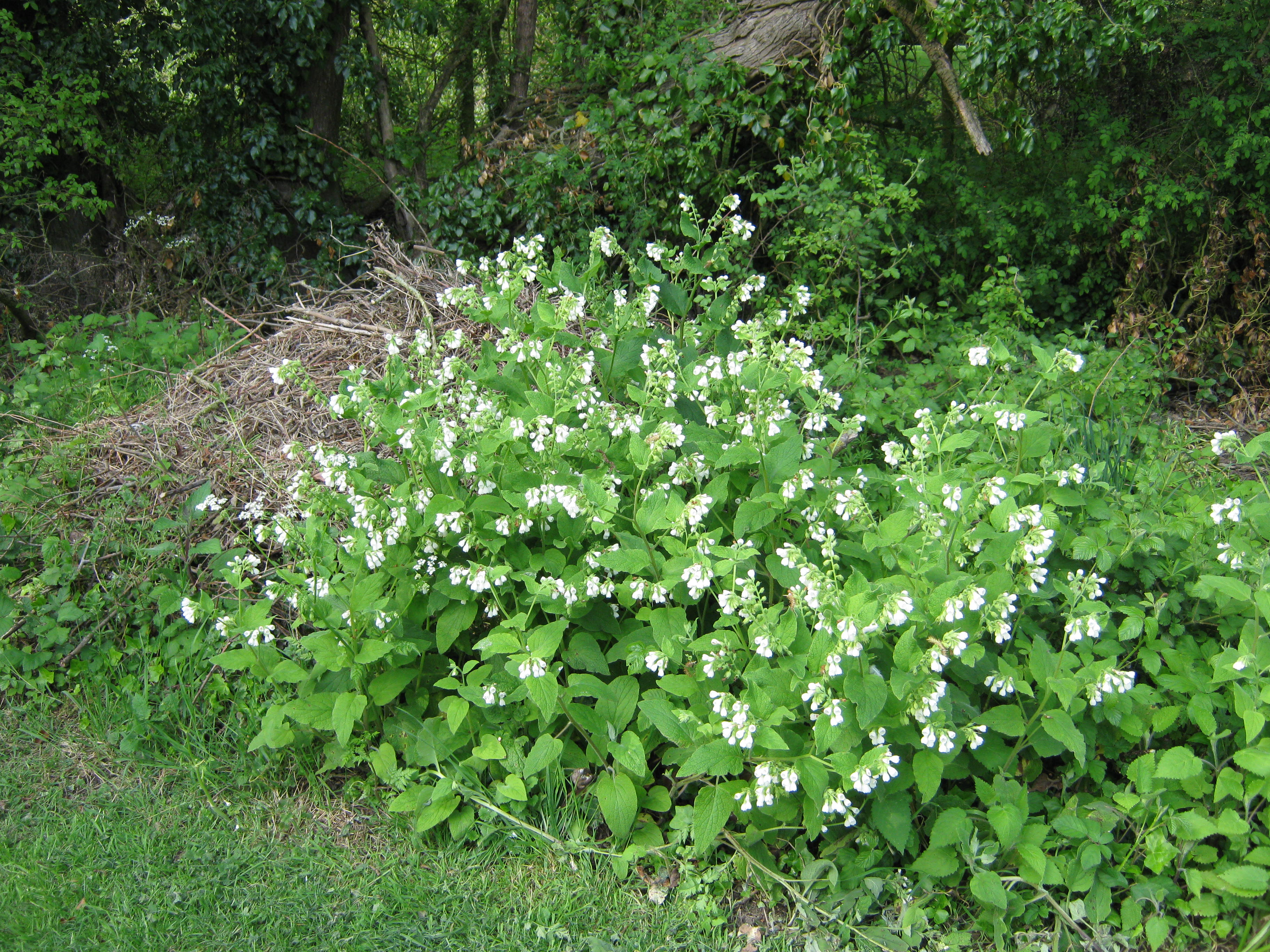 These are the English Bluebells (Hyacinthoides non-scripta) I am trying to establish next to the weeping crabapple. I have put canes alongside them to remind us not to mow them until the seeds have set and the leaves have died. I am also hoping that the canes will stop the deer from trampling the plants.