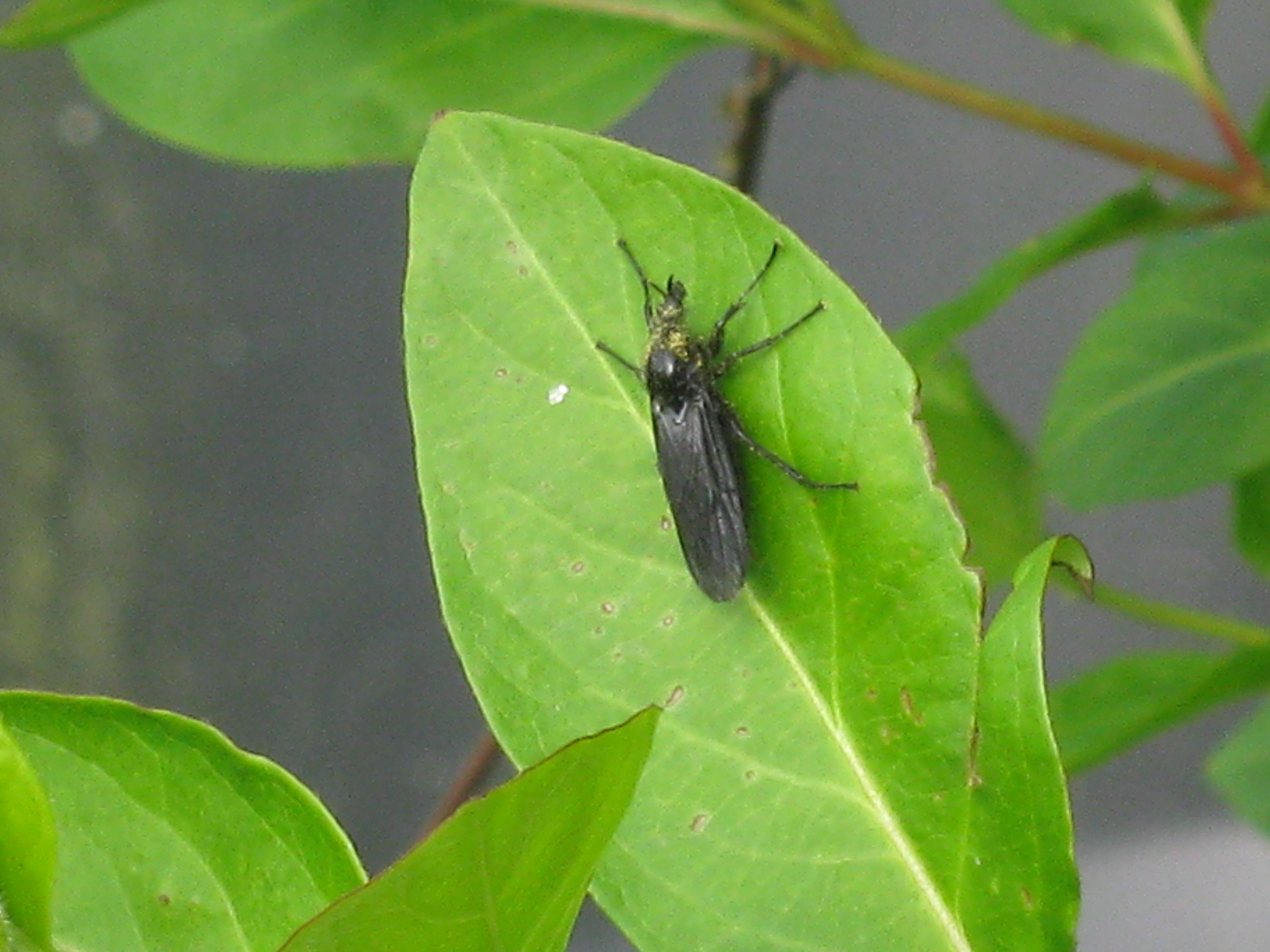These are St. Mark’s-flies (Bibio marci) doing what flies do in the spring. The female is the upper fly and she has smoky-grey wings and a small head. The lower fly is the male and he has silvery wings and a larger head. Both sexes have spines on their front legs at the tip of the tibia. You can just see this on the female’s front leg. These flies fly weakly and slowly and dangle their legs as though the effort of flying is almost too much for them. They are called St. Mark’s-flies because they usually appear on or around St. Mark’s day which is April 25th.  This photo was taken on 2nd May – it was a cold spring!