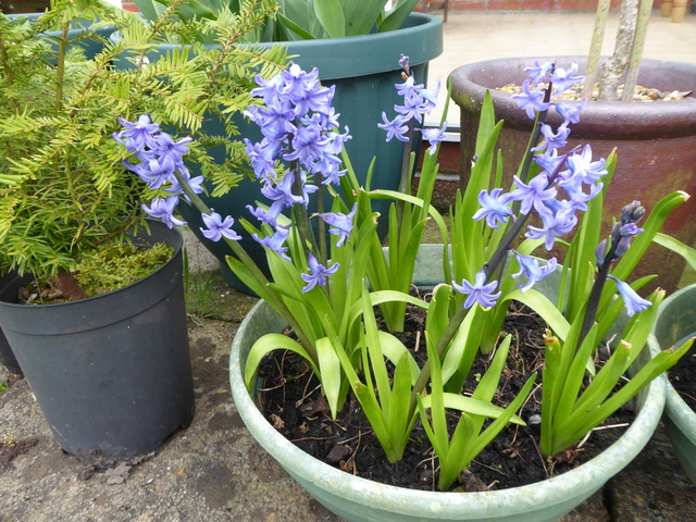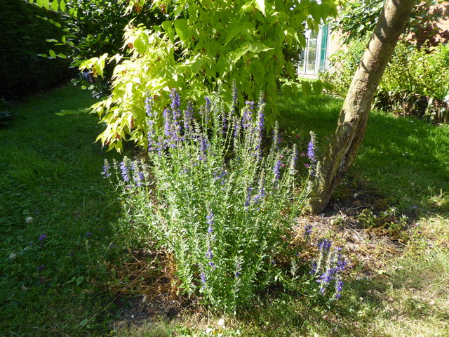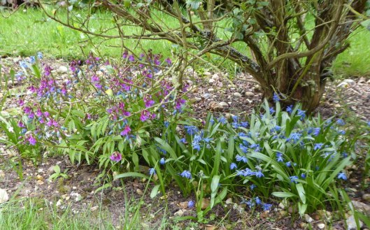 This is a very narrow bed alongside the rear of the garage next to the back door. All the flowers are blue and two of the plants have variegated yellow and green leaves. However, just to prove that nothing goes exactly to plan, the bed also contains a red-berried Firethorn ( Pyracantha) which has creamy white flowers; this plant was here when we moved here and the birds and bees love it.
