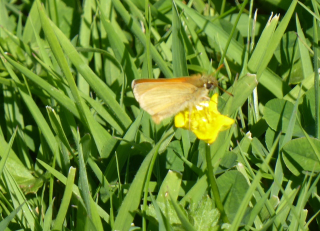 A poor photo of an Essex Skipper butterfly (Thymelicus lineola) sitting on a buttercup flower.