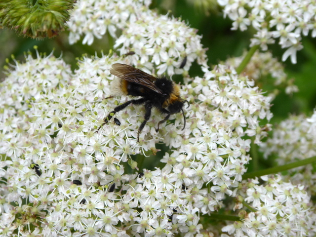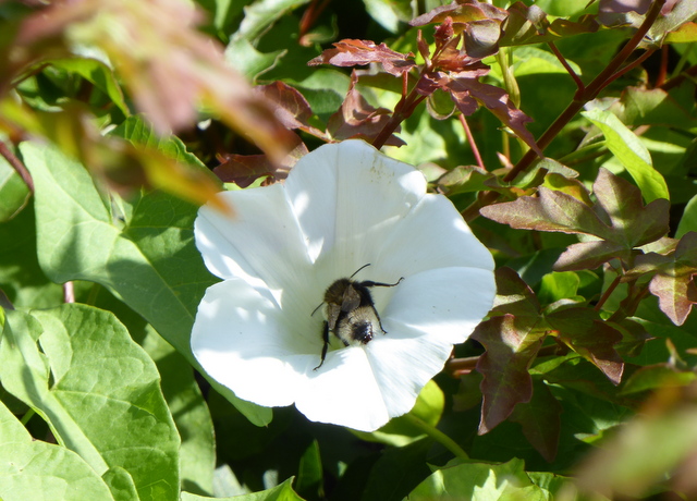 We are lucky (?) to have both Field Bindweed, as in the former photo, and Hedge Bindweed (Calystegia sepium) as here, in our garden. This one was being visited by a bumble bee.