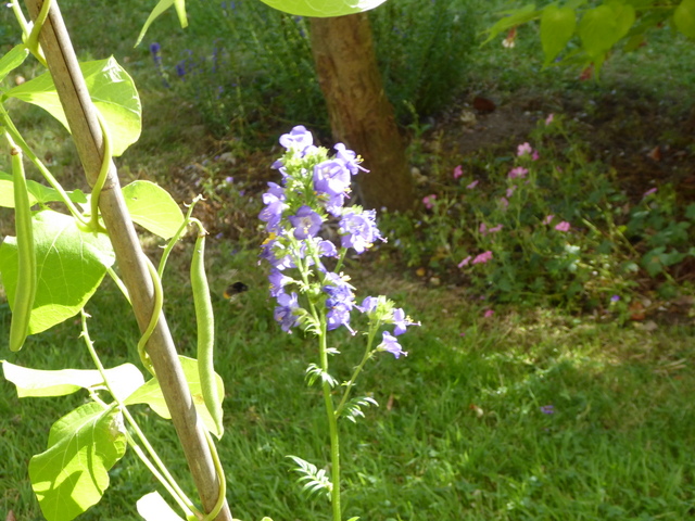 The beans with a Jacob’s Ladder (Polemonium caeruleum) flower-spike and a bumble bee flying towards the Jacob’s Ladder.