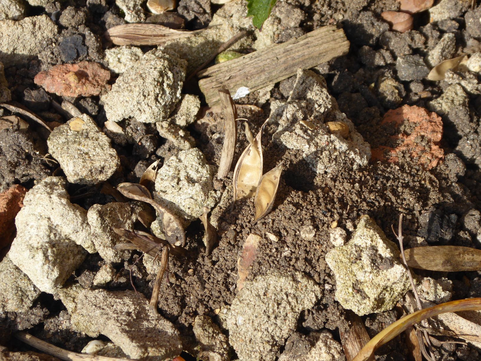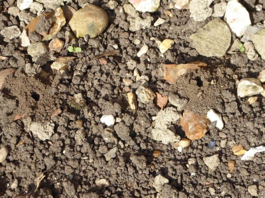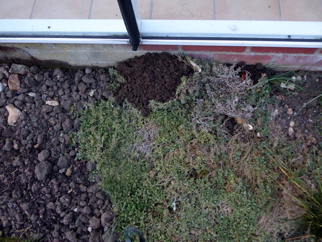 This is a mole hill that appeared in the rather dry border next to the conservatory. The hill got bigger the following day and many spring bulbs were uprooted.