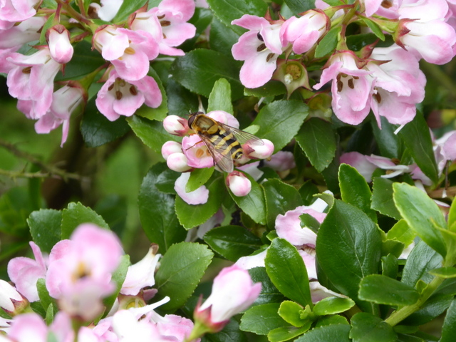 Hoverfly Syrphus ribesii on Escallonia ‘Apple Blossom’