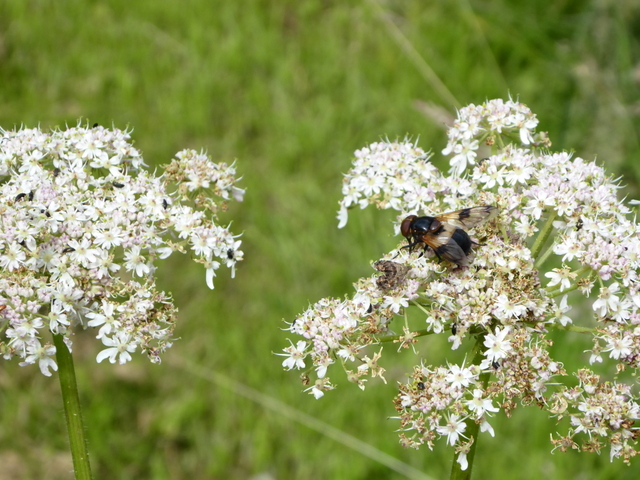 Creeping Thistle (Cirsium arvense) with a Hoverfly (Helophilus pendulus) on the lowest flowerhead