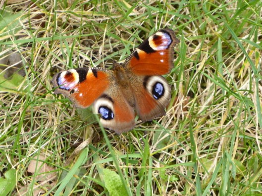 This slightly battered Peacock was sunning itself on the path. They are very hairy-bodied insects and the colours and markings on the wings are beautiful. I noticed for the first time the lovely tiger-stripe yellow and black ‘shoulders’ on the fore-wing.