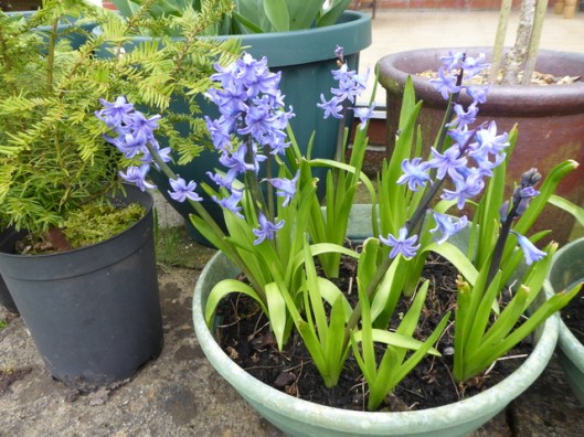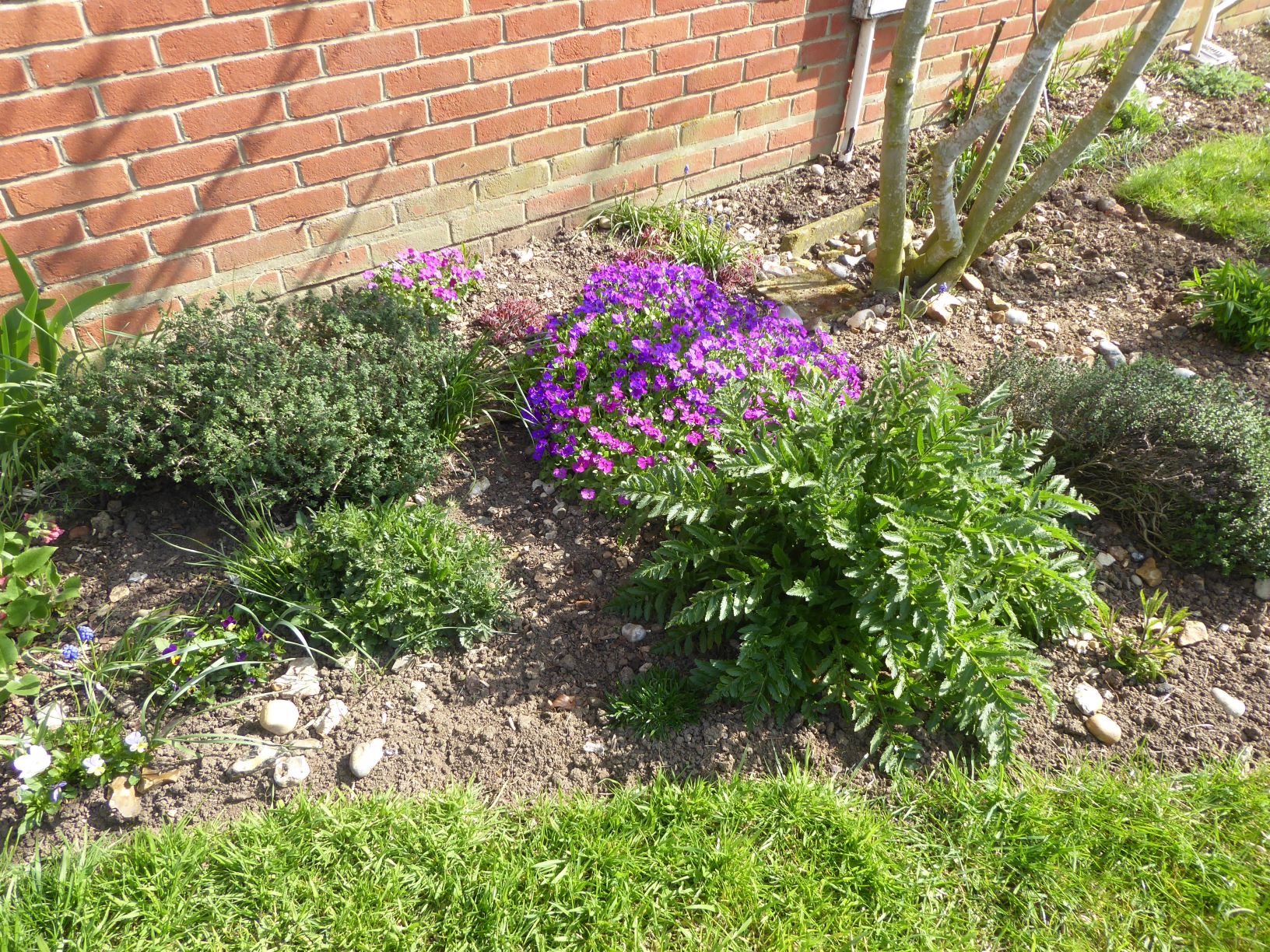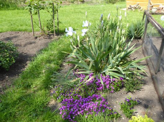 The temperatures began to improve during May and the leaves on the fig tree (on the right of the photo) began to come out. The perennial plants also put on a lot of growth and flowers appeared.