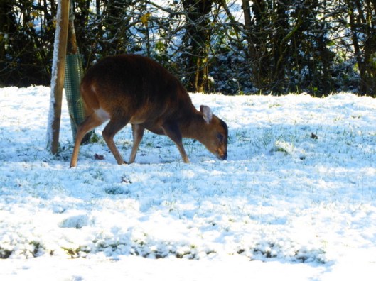 This photo was taken with my phone early one March morning. You can see the maple leaf sticker on the glass which works well at preventing birds from crashing into the window and injuring themselves. Just outside the window is my witch-hazel which is planted in a large pot and also a Japanese flowering-cherry tree tied to canes, in a different pot. We keep both trees up close to the front of the house to protect them from wind damage. On the other side of our drive you can see the first of the daffodils in flower along the edge of the ditch. What really excited me was the sight of a leveret, a young hare ( lepus europaeus), crouched in the grass. Richard had had a sight of this young animal in the garden a couple of days before this and I was so pleased to see it for myself.