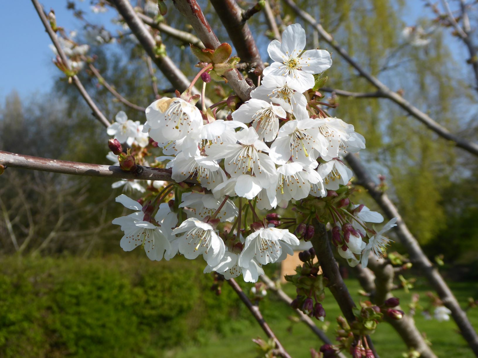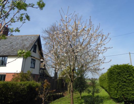 This is one of our wild cherry trees just coming into blossom in the middle of April. The house on the left of the photo is that of our next-door neighbours and this long thin strip of land, in-between their garden and our leylandii hedge on the right, belongs to us and is where the former owners of our house used to park their combine harvester, so we are told. We have planted a few trees on this strip of land; you can see a couple of hollies and another cherry has decided to grow here too.