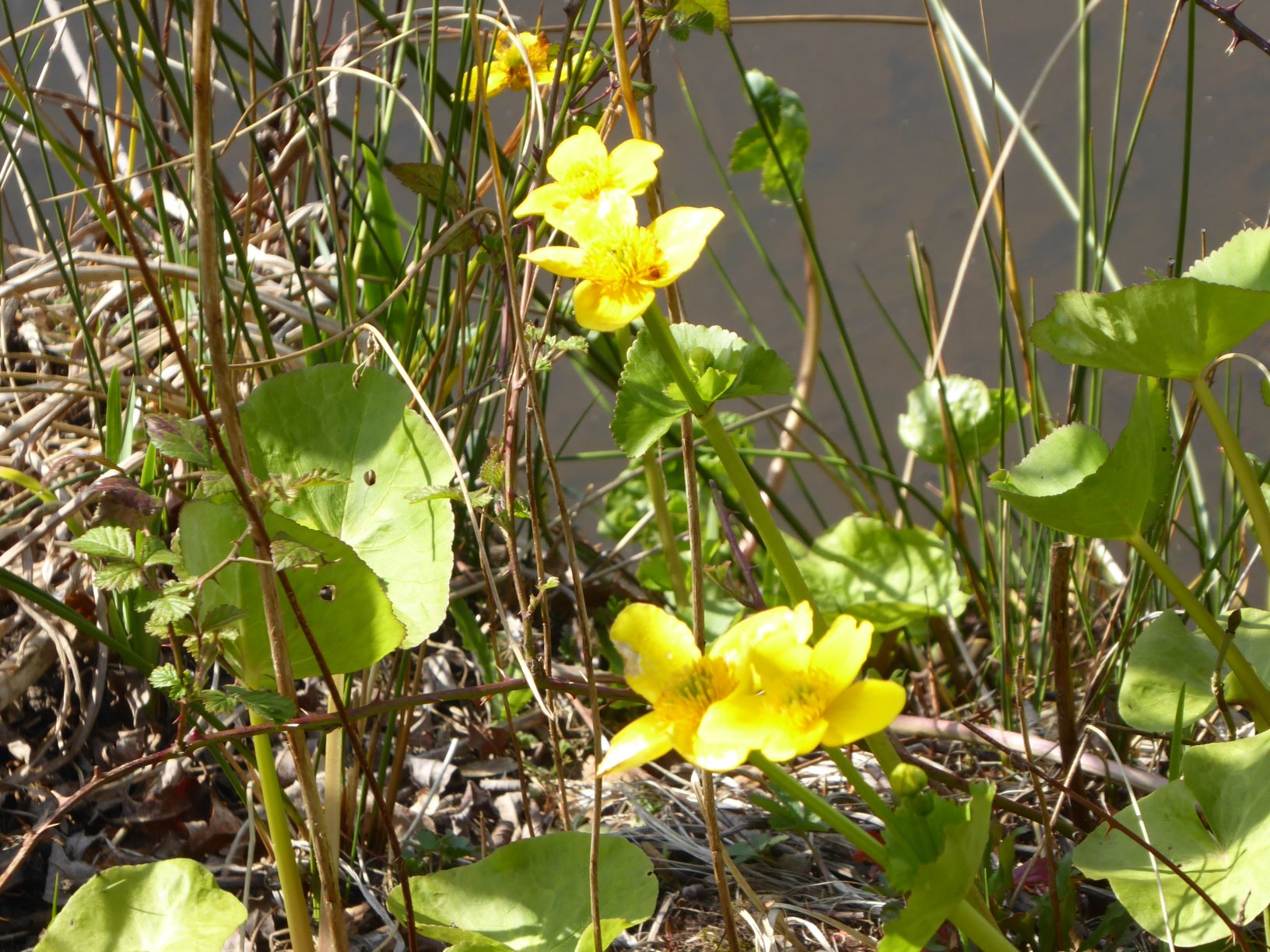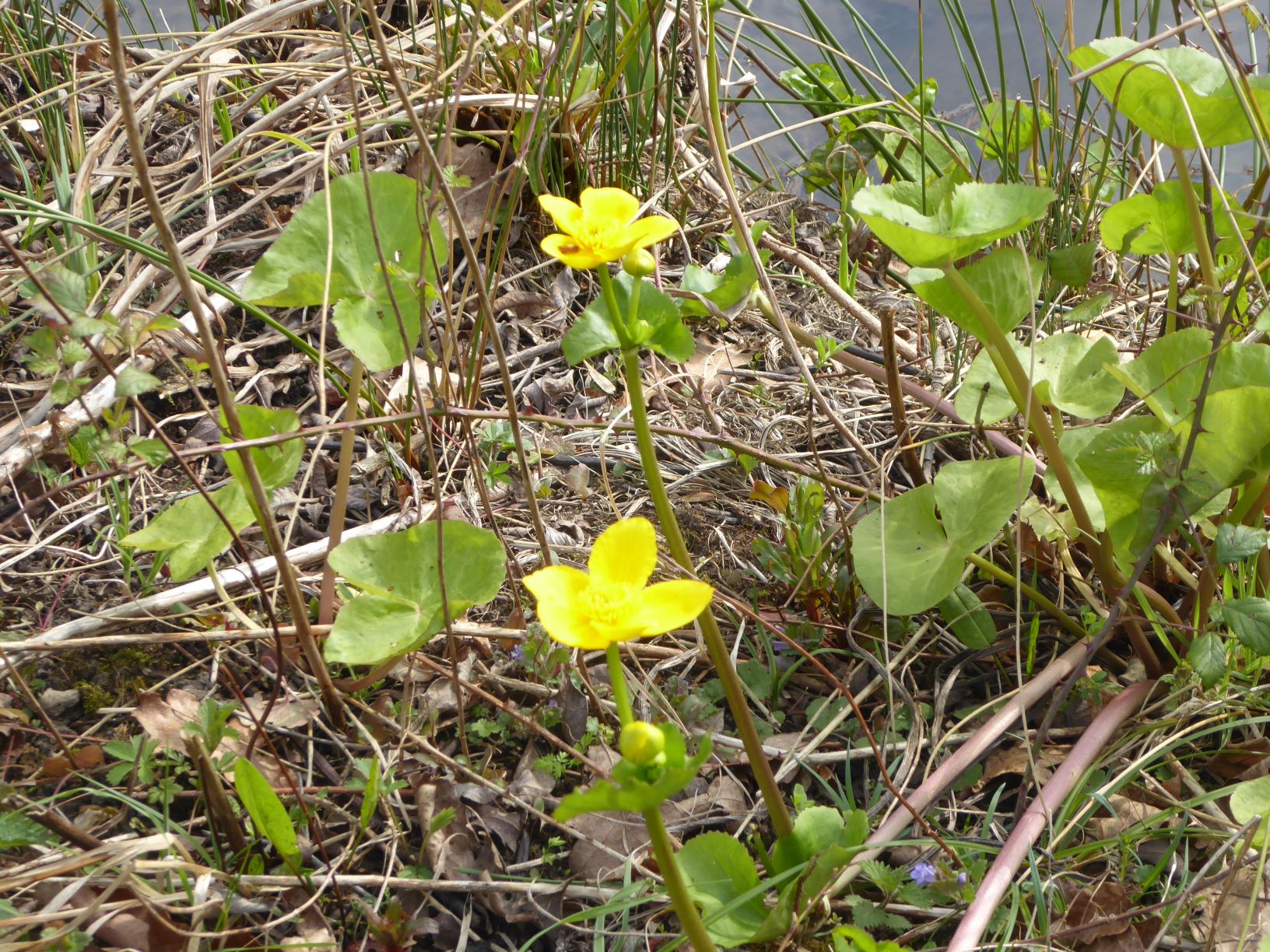 Marsh Marigold or King-cup ( Caltha palustris) next to the pond