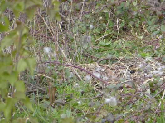 While watering my green beans the other day I noticed some tiny white eggshells lying on the ground and wondered where they could have come from. Richard looked into the branches of the Laburnum tree above us and saw a tiny nest that I hadn’t been able to see – (I am quite a lot shorter than he is). It was a windy day and the pieces of shell must have been dislodged by the breeze. A week later I found the nest on the ground and here is my photograph of it.