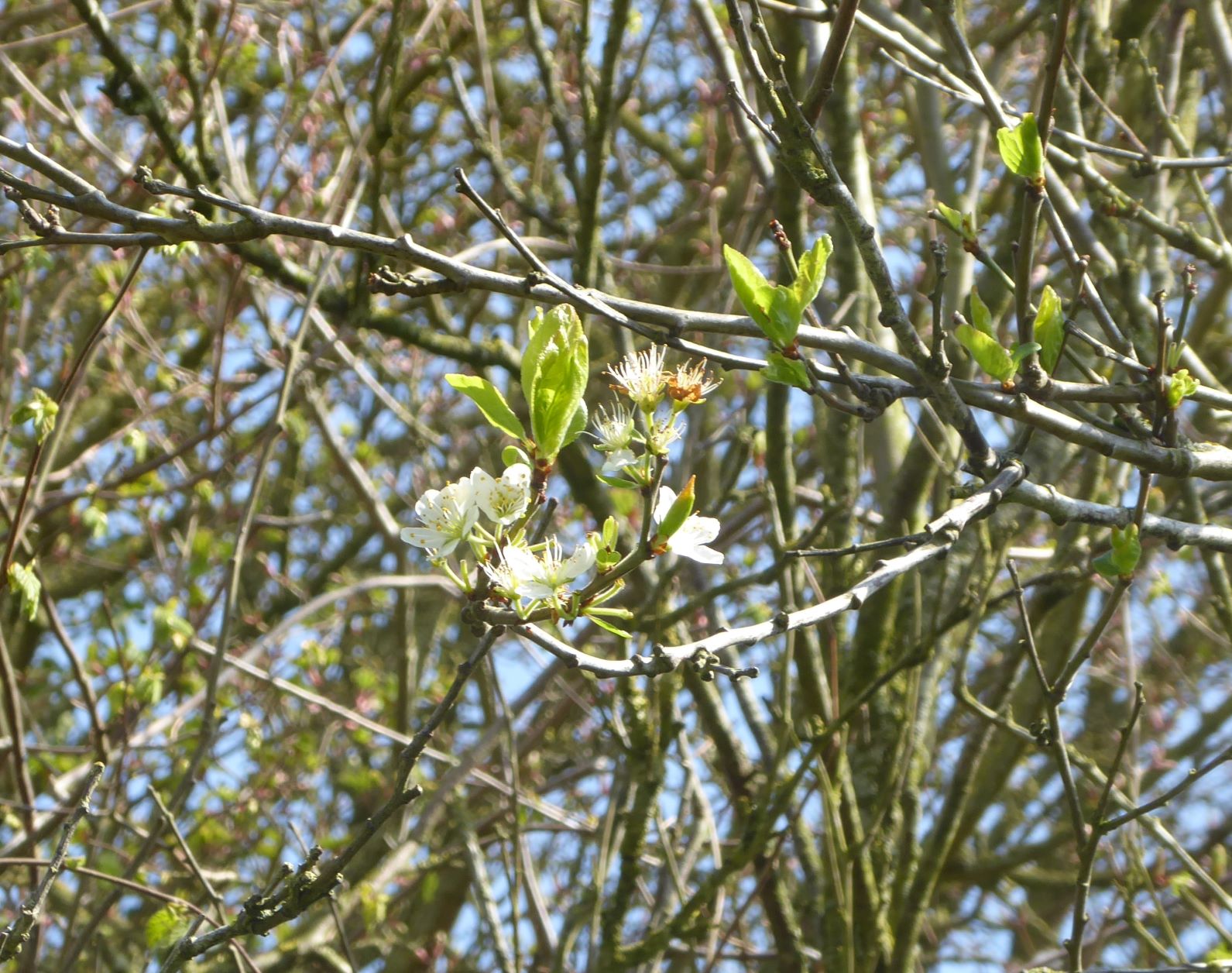 We have a couple of spindly Damson or Bullace (Prunus domestica ssp. insititia ) trees growing in the scrubby area near our pond. This is a photo of the blossom and new leaves.