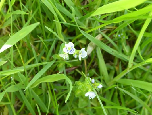 This is a minute-flowered speedwell I find in the lawn and in the grass path round the pond. It forms patches of flowers as the stems lie flat along the ground and send out roots from nodes. The flower stems are upright.
