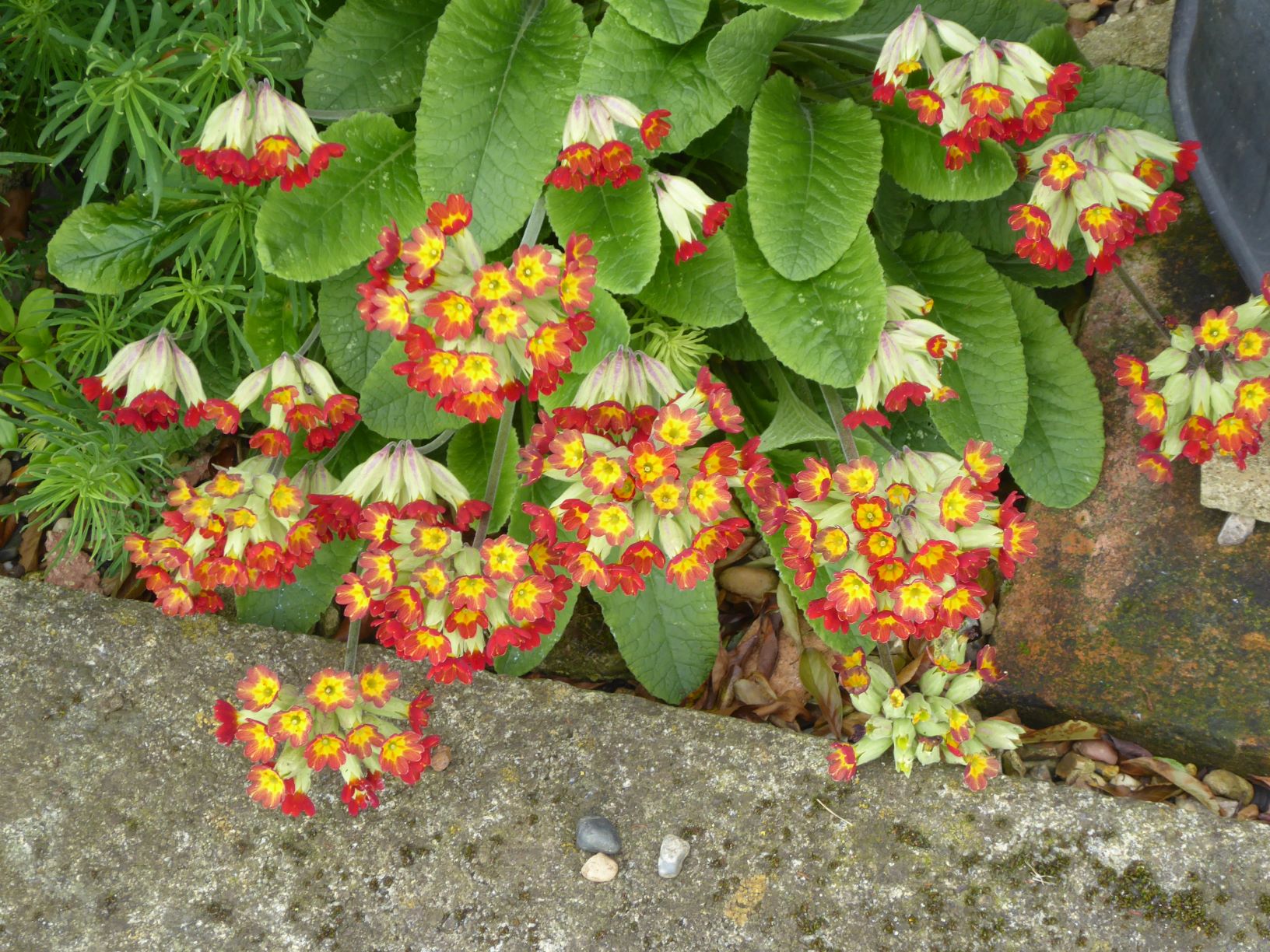 All around our garden are hybrids, like this one, between the wild cowslip and garden polyanthas and primulas. This plant decided to grow in a gravelly area next to a drain and one of the water butts.
