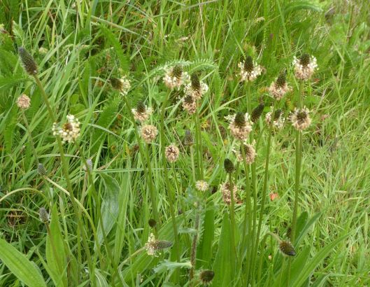 I wonder if children still play the old games with Ribwort. In one of the games, the stalk is held between the thumb and forefinger and the bottom of the stalk is wrapped round the flower-head in a loop. When the loop is tugged sharply the flower-head is ‘fired’ and often travels a long way. I read that a form of ‘conkers’ can be played with Ribwort by keeping the flowerhead on its long stem and using it to attempt to knock a rival’s flower-head off. A couple of local names for Ribwort are ‘fighting cocks’ and ‘kemps’ from the Anglo-Saxon ‘cempa‘ meaning ‘a warrior’.