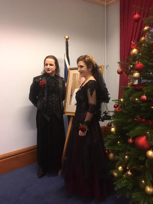 After many years trying to get a full-time job Alice was at last successful and began working at Manchester Metropolitan University in November. She now has a challenging job as befits someone with a doctorate but has to commute from her home in Sheffield to Manchester each day. There are regular problems with the trains and she often doesn’t get home til very late. However, once she is on the train she can enjoy an hour’s reading which is a great pleasure to her. She will be receiving her doctorate at a graduation ceremony in a couple of weeks time. She and her partner, Phil got married on 1st December. They organised the event themselves and as they couldn’t afford a big wedding they only invited very close family and friends. There were eighteen of us all together and the wedding was a Goth-themed one. We had a wonderful time and we all got on very well together.