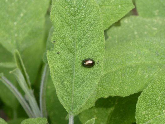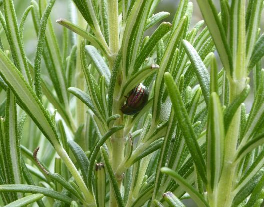 I have been finding these attractive beetles on my rosemary, lavender and sage plants for the past couple of years. They are a non-native invasive species of beetle related to the Colorado Beetle. They do a fair amount of damage to plants if left unchecked and can kill young plants. Because of our recent mild winters they are active throughout the year. Here is a link to the RHS website which describes the beetle.