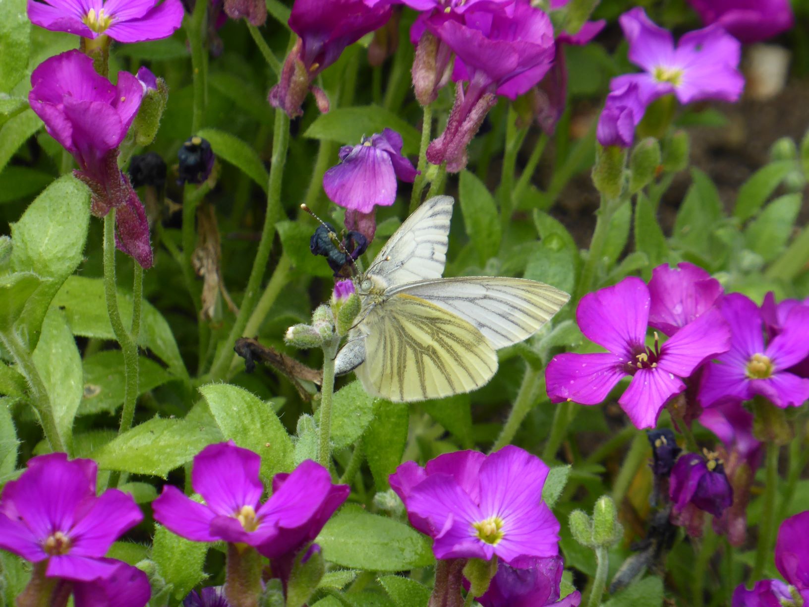 I saw a number of these white butterflies this year. I read that the green-veined white prefers to lay its eggs on wild members of the cabbage family ( watercress, garlic mustard etc.) rather than on plants in our vegetable gardens. This one appears to be laying eggs on my aubretia, which is also a member of the cabbage family!