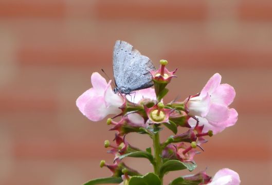 I saw quite a few holly blues this year which probably means they will be scarce again next year. The caterpillars are often attacked by two species of parasitic wasp that sometimes wipe out whole colonies of holly blue. The male and female butterflies’ underside of their wings looks alike so I can’t say which this is. It refused to open its wings all the time I was watching it and then flew off at speed the moment my attention wavered!