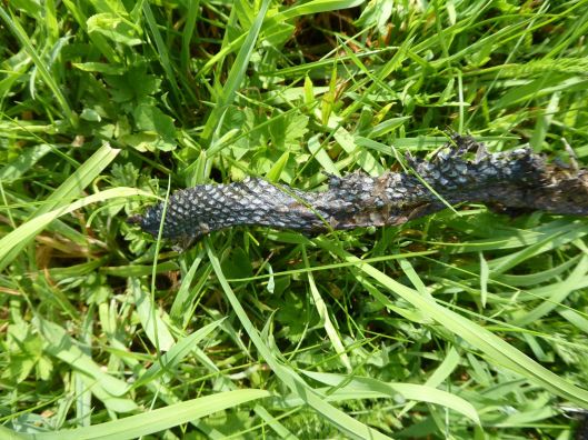 We often see grass snakes in our garden but this year this is the closest I got to one. They are Britain’s longest snake at one metre in length, occasionally longer. They are variable in colour and pattern being either green, olive-green, brown or grey. They have a yellow to orange-red collar just behind their head and have regular black markings along their sides (or not, as the case may be!) They are very good swimmers.