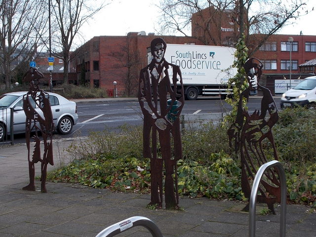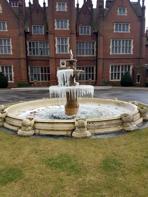On Monday we had snow showers all day.  Stronger spells of sunshine at midday melted all that had fallen on the driveway and paths but didn’t shift the snow on the flowerbeds and grass.  Richard took Elinor to Norwich for her acupuncture appointment and found that there had been no snow there at all.  The fountain outside the hotel where Elinor has her acupuncture was spectacularly frozen.