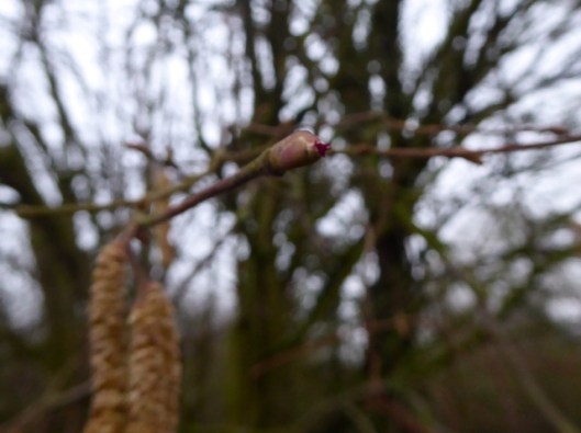 Before the snow arrived I made another attempt at photographing our hazel catkins and found a few female flowers as well.