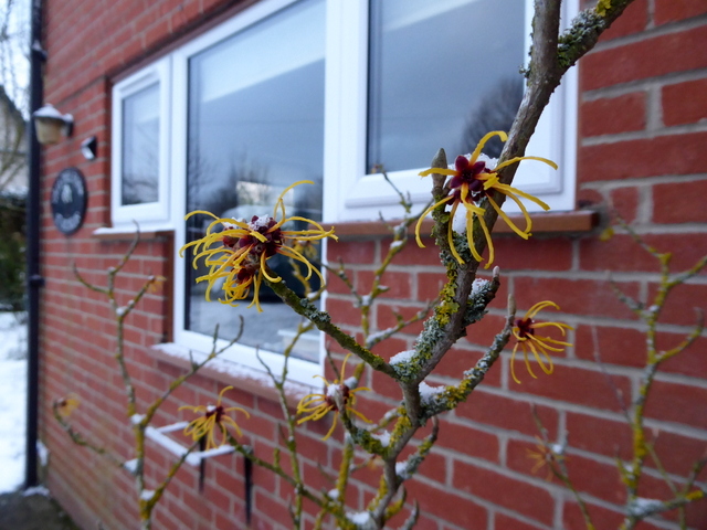 Witch-hazel flowers dusted by snow