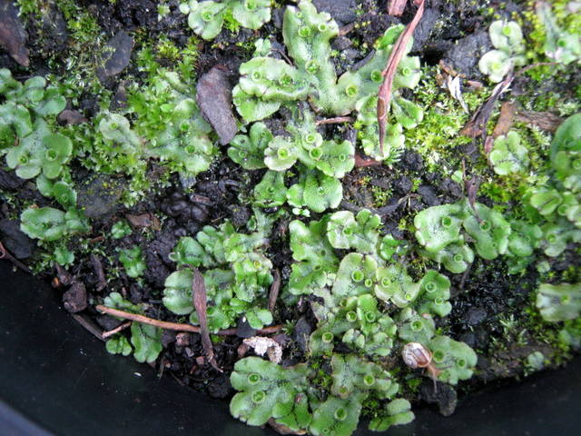 This pot was covered with liverwort Marchantia polymorpha. It has little green cups on the leaf-like structures (thallus). Do you see the baby snail?